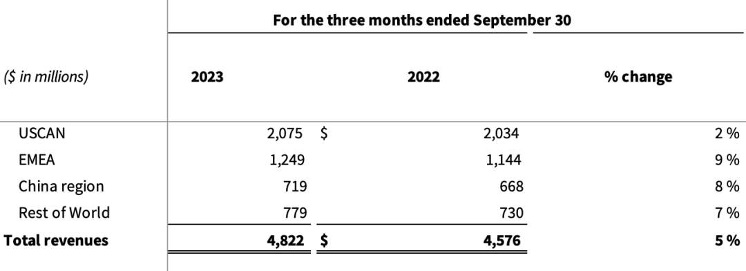 欧洲、中东和非洲地区:营收12.49亿美元,占比26%,同比+9% 中国地区:营收7.19亿美元,占比15%,同比+8%