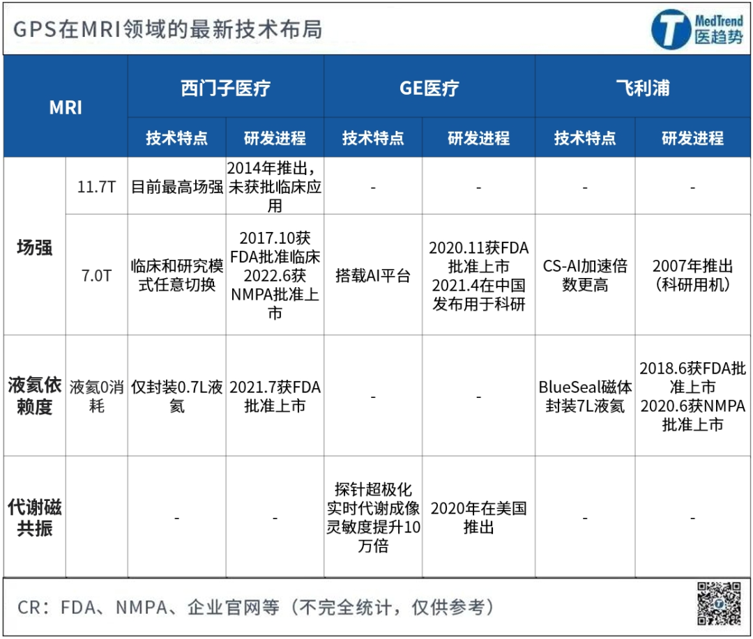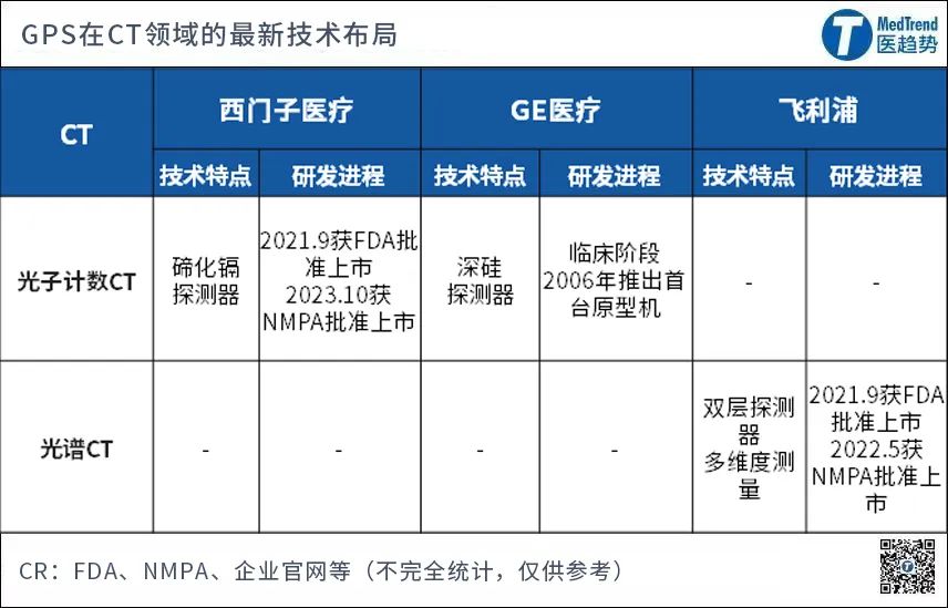 前三季度,GE医疗共营收143.46亿美元,同比+7%; 2023年Q3,飞利浦营收44.71亿欧元,同比+4%;其中诊断&治疗业务收入22.01亿欧元,同比+6%,互联关护+3%;若按可比销售额计算,三大业务均保持正增长。利润:调整后的EBITA增长至4.57亿欧元,利润率从2022年第三季度的4.8%提高至10.2%,主要受销售、定价和生产力措施的推动。从订单量来看,可比订单量下降9%,主要由于诊断与治疗和互联关护细分市场的订单量较低。这已是连续第5个季度下降。医疗业务(诊断与治疗+互联关护):整体营收34.33亿欧元,同比+5%,占总营收的76%,与去年同期的占比相同。诊断和治疗业务:营收22.01亿欧元,同比+6%。在飞利浦总营收中占比49% ,是飞利浦占比最大、增长最高的业务板块。互联关护:营收12.32亿美元,同比持平,可比销售增长+10%。在飞利浦总营收中占比28%。成熟区域(包括西欧、北美和其他成熟地区):营收31.71亿欧元,贡献总营收的70%。其中,西欧是飞利浦第二大市场,同比增长10%,其他地区为个位数增长;若按可比销售增长计算,所有地区均为双位数增长。增长区域:营收13.0亿欧元,同比+1%;按可比销售增长率,为所有地区中最高,达12%。前三季度,飞利浦共收入131.07亿欧元,较去年同期的124.05亿欧元增长5.7%,其中诊断和治疗业务增长最大,为10.01%。员工方面,截至今年9月飞利浦共70741人,比去年同期的79097人减少了8356人;2022年10月Roy Jakobs接任CEO后开启了裁员1万人的计划,目前仍在进行中。以医疗影像领域最常用的两类产品(CT、MR)来看,GPS对于新技术的布局你追我赶,竞争加码。CT领域:能量CT西门子医疗与飞利浦齐头并进,GE医疗新路线加紧追赶 在备受关注的光子计数CT领域,西门子医疗捷足先登——目前获批上市的光子计数CT仅其一款。今年5月,西门子医疗投资6.4亿元(8000万欧元)加码光子计数CT,在德国建造一家新工厂来生产光子计数CT探测器的半导体晶体材料(碲化镉)。而西门子医疗的有力竞争者,已经研发光子计数CT多年的GE医疗,目前走的是另一条技术路线——基于硅基探测器的光子计数CT。在光谱CT领域,飞利浦进度领先。2021年,飞利浦新一代光谱计数CT——皓克Spectral CT全球发布,首次实现更前沿的光谱科研和全面常规化光谱临床应用。MR领域:西门子医疗超高场强领先,飞利浦“无液氦”最早 磁共振成像的两大发展趋势是高场强和无液氦消耗——场强越高成像质量越高,对液氦的依赖越少,设备日常的运行维护成本越低。 在去液氦化上,飞利浦和西门子医疗已率先推出液氦0消耗的产品。11月下旬,2023北美放射学会(RSNA)年度会议即将召开,届时三巨头的最新技术进展将会展示,让我们期待新的“大招”放出。随着集采范围的扩大,大型医疗设备的集采已有个别地区抢先试点;对GPS来说,有可能进入集采的中低端主流产品,也需要得到特别的关注。超声产品已有先例。2022年11月,海南第一批大型医疗设备集采中标公告发布,最高降价幅度47.83%,合计3470万的采购金额,飞利浦占比约50%。CT方面,中低端医疗设备仍是市场主力。根据弗若斯特沙利文数据,按销售额来算,2021年全国CT销售额150亿元,其中16排和64排及以上CT占比分别为37%和29%,仍是常见机型。在福建省2022年大型医用设备集采通知中,就包含了64排CT、256排及以上CT,不过由于投标人数不足三家,不满足采购流程标准而废标。 MR方面,MR的情况与CT相似,但有略微不同之处。目前,主力机型1.5T MR市场距离饱和还有较长时间,以至于厂商为了争夺1.5T磁共振市场不断降价。2020年开始,安徽省医保局在全国率先以“省”为单位、开展全省公立医疗机构乙类大型医用设备集中采购工作,其中包括1.5T磁共振(中标单价297万元),3.0T磁共振(中标单价587万元),3.0T磁共振首次跌破600万元。试点-扩面模式是主流的集采趋势,先在省内试点,再做省集采,逐步走向省联盟,达到全国集采的实质性目的。如今,医改先锋地区大型医疗设备试点采购已跃跃欲试,“带量采购”还有多远?