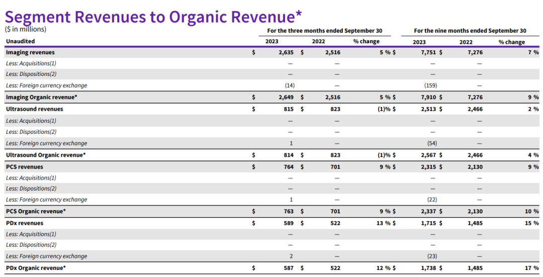 超声(占比17%):包括控制器和探头,手持设备术中成像系统可视化软件,服务和数字解决方案。营收8.15亿美元,去年同期为8.23亿美元,基本持平。