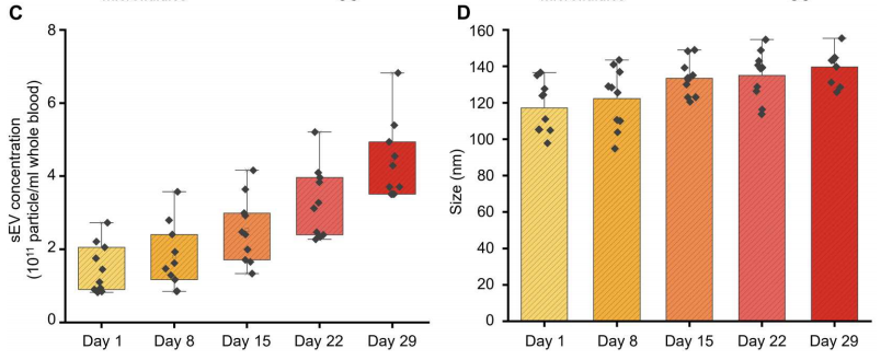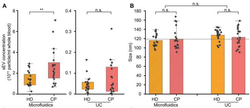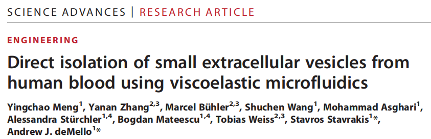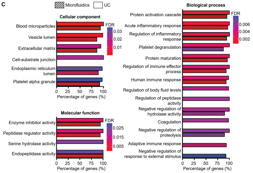 介绍 小细胞外囊泡(sEVs;< 200nm),含有脂质、核酸和蛋白质,sEV存在于所有体液中,因此是无创诊断和预后生物标志物的极好来源,包括癌症、感染、神经退行性病变。基于超速离心(UC)、梯度离心等传统sEV分离方法存在一系列局限性,包括处理时间长、收率低(5%至40%)、分离sEV完整性低和设备成本高。尽管许多新sEV分离方法已经减轻了上述一些问题,但它们远非理想,会引入其他问题比如纯度低及样本损失等。 在过去的十年中,微流体技术已经越来越多地被用作sEV处理和分离的基本工具,根据分离模式的不同,微流体分离sEV的策略可以分为被动和主动两类。被动分离方法不需要施加外力,而是通过使用大小相关的水动力或复杂的通道结构来分离sEV。相反,主动分离方法需要应用外力场,尤其是声场、电场和磁场来操纵sEV。主动方法已成功地用于分离血源性sEV,其特点是分离效率高,但设备制造和操作复杂,这限制了在临床环境中的使用。被动微流体系统也已成功地用于从全血中分离sEV,但受到了分离效率和回收率低、通量低的限制。在临床环境中,迫切需要制造成本低廉,操作简单,不需要专业知识,涉及最少的样品制备,并产生一致和可重复的结果,同时提供高分离纯度和回收率的EV分离系统。 近日,一组来自瑞士的研究团队在杂志Science advances上发表了一篇题为“Direct isolation of small extracellular vesicles from human blood using viscoelastic microfluidics”的文章。文章中,作者提出了一种被动、高效、粘弹性和无标签的微流体装置,能够直接从人体血液中分离sEV。集成系统包括两个模块:细胞去除模块和sEV分离模块。为了证明该系统在临床液体活检中的有效性,作者从20名癌症患者(CP)和20名健康献血者(HD)的血液中分离出sEV,并将其浓度和大小与通过金标准UC获得的数据进行比较。与现有的sEV分离技术相比,此粘弹性微流控平台具有低成本、易于操作、高sEV回收率和高纯度的特点,可用于科研和临床研究。 图片来源:Science advances 主要内容 粘弹性sEV分离的芯片设计及工作原理 下图展示了微流控装置的结构和sEV从全血分离的潜在机制。简而言之,该装置由两个按顺序排列的模块组成:细胞去除模块和sEV分离模块。工作原理是通过流体流速,可以使较大的物种迁移到中心线,而较小的物种保持在靠近侧壁的位置,这样物种可以根据大小进行分离。在第一个模块中,微米级的血液成分,特别是白细胞、红细胞和血小板,被有效地从血液样本中去除。随后,现在“无细胞”的血液被无缝地引入第二个模块,在那里sEV被分离并与其他EV亚群分离。 用于全血sEV分离的粘弹性微流体系统示意图。 图片来源:Science advances 从复杂混合物中分离直径为100纳米的颗粒 为了确定最佳的流动参数,作者测量了直径为500 nm的颗粒的颗粒轨迹。通过优化,当I1、I2、I3的流速分别为200、2000、3000 μl/h时,500 nm的颗粒从指定出口排出。在此优化流动条件下,在细胞去除模块内(下图E,上排),大颗粒(12 μm、7 μm和3 μm)沿着中心线集中并通过出口O1排出,而小颗粒(1 μm、500 nm和100 nm)沿着靠近侧壁的流线移动,从而能够进入sEV隔离模块。在sEV分离模块内(下图E,下排),直径为1 μm和500 nm的颗粒被导向出口O2,而直径为100 nm的颗粒则通过出口O3被收集。对O3出口流出流体的分析表明,94.88%的颗粒粒径为100 nm,100 nm颗粒(sEV的代表)在O3出口的回收率为77%。这些数据证实了在连续流动下从复杂混合物中被动和高效地分离100纳米颗粒。 颗粒分离的理论预测与实验分析。 图片来源:Science advances 从人血中直接分离sEV 为了展示粘弹性微流体装置在sEV分离中的应用,作者将荧光标记的sEV (mg -sEV)加入稀释的全血中。初始加标样品主要由白细胞、红细胞和血小板(88.6%)组成,其中少量(9.7%)为mg-sEV。几乎所有的白细胞和红细胞以及绝大多数PLT(97.1%)在细胞去除模块中被有效地去除,而lEV、mEV和剩余的血细胞在sEV分离模块中进一步去除。最后,从O3出口提取mg-sEV,纯度和回收率分别在97%和87%以上(下图A)。 接下来,作者进行了AFM和TEM测量,观察了在出口O3收集的分离sEV的形态。AFM图像描绘了圆形纳米结构,尺寸范围在50到100纳米之间。TEM测量如下图D所示,观察到典型的杯状结构(蓝色箭头所示),表明完整但脱水的膜性囊泡。TEM图像还证实了样品中脂蛋白的存在(用红色箭头标记),观察结果与先前对含sEV的血液样本的TEM研究一致。最后,通过WB分析进一步验证微流控装置在全血sEV分离中的有效性。从微流控装置分离的sEV样本和UC都表达了相似水平的外泌体蛋白HSP70、TSG101、CD81和CD9(下图E)。这证实了使用两种分离方法都可以有效地富集外泌体。 全血sEV分离物的微流控特性研究。 图片来源:Science advances 用微流体和UC纯化的血源性sEV显示出 相似的蛋白质组成 为了进一步研究和比较UC和微流控装置分离的血源性sEV样品的蛋白质含量,提取两种sEV样品中的蛋白质,并使用质谱蛋白质组学进行分析。两种sEV分离方法检测到的肽和蛋白数量相似:UC来源sEV样品检测到的肽和蛋白数量为3114条,蛋白数量为210个;微流体来源sEV样品检测到的肽和蛋白数量为2711条,蛋白数量为172个。从检测到的蛋白质中,“囊泡腔(Vesicle lumen)”和“血液微粒(blood microparticles)”被确定为过度代表的成分,从而证实在标准的UC和基于微流体的分离工作流程中,EV相关蛋白都被富集(下图C)。总之,蛋白质组学