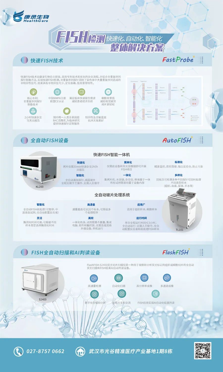 快速FISH技术由康录生物自主研发,采用专利技术和优化的杂交流程,并结合非重复序列探针制备方法,实现快速FISH检测。非重复序列探针消除了染色体中大量重复序列造成的非特异性信号,结果具有非特异信号少、定位准确、低背景杂讯等特性。应用最新的快速FISH技术,可与传统的FISH技术取得同样甚至更佳的检验结果,并可完全代替进口试剂及设备,并且由于其创新的自动化前处理设备、全自动FISH处理设备、智能化荧光扫描和AI结果判读设备,结合优化的操作流程,可实现病理科FISH检测的“一日快检”,实现FISH检测快速化、自动化和智能化,从而最终实现样本进,结果出的全自动FISH检测,彻底解决临床FISH检测痛点问题。并且,康录生物是国内唯一拥有人类全基因组BAC克隆库,可以提供定制探针服务,为临床稀有探针的定制和临床科学研究提供学术支持,为患者靶向治疗、精准诊断、早期筛查、复发监测和预后分析等提供有力帮助。