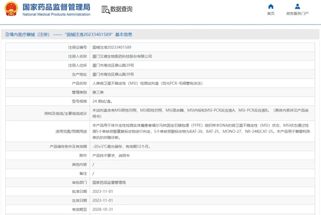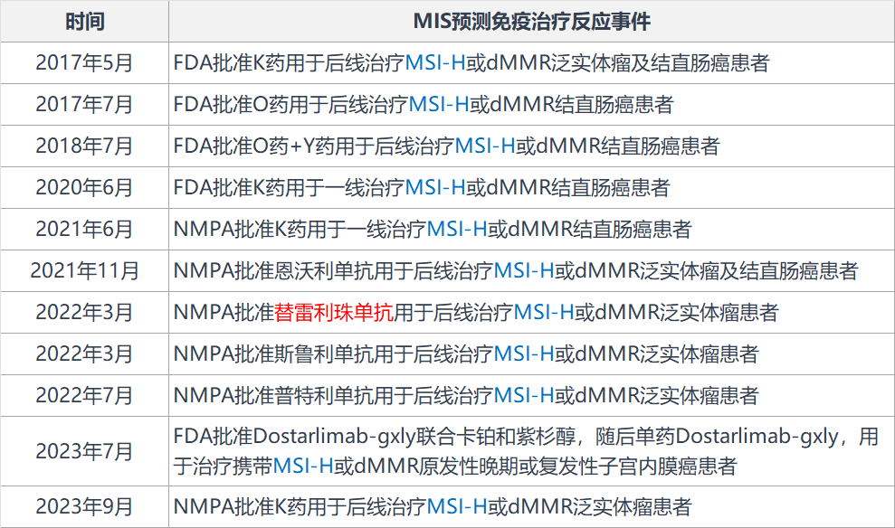 MSI(微卫星不稳定性)是一种用于癌症检测和治疗的生物标志物,最初用于识别Lynch综合征(遗传性非息肉病性结直肠癌)患者,但近几年已成为预测患者在免疫治疗反应方面的关键指标。 ▲ 监管批准MSI作为预测免疫治疗反应关键指标事件 2023年11月1日,国家药品监督管理局(NMPA)批准厦门艾德生物医药科技股份有限公司的“人类微卫星不稳定性(MSI)检测试剂盒(荧光PCR-毛细管电泳法)”产品上市,用于替雷利珠单抗(百泽安,百济神州)的伴随诊断。1 值得注意的是,这是我国首个泛瘤种免疫治疗MSI-PCR伴随诊断试剂盒,用于筛选可能从替雷利珠单抗治疗中获益的MSI-H实体瘤患者。同时,也是监管认可的首个同步开发伴随诊断试剂盒。 ▲ NMPA批准首个PCR-Based MSI伴随诊断产品 MSI是MMR蛋白功能缺陷导至的结果。 自1993年被发现以来,MSI作为一种生物标志物已经发展了很多年。2,3 最初,MSI检测被用于识别Lynch综合征患者,但随着MSI肿瘤状态预测对某些类型免疫治疗反应的发现,临床对MSI检测的需求激增。4 1997年,美国国家癌症研究所(NCI)首次推荐使用 Bethesda panel 用于MSI-PCR标准化检测,该panel包含2个单核苷酸重复标志物(BAT-25、BAT-26)和3个二核苷酸重复标志物(D2S123、D5S346、D17S250)。检测肿瘤MSI状态时,如果2个或2个以上的标志物不稳定,则为MSI-H(高度微卫星不稳定性),如果只检测1个标志物不稳定,则为MSI-L(低度微卫星不稳定性),如果没有标志物显示不稳定,则为MSS(微卫星稳定)。5 2004年,MSI检测进入到下一个关键发展阶段。Promega公司和Mayo诊所对 Bethesda panel 进行修订,合作开发了一个由5个单核苷酸重复标志物组成的panel(BAT-25,BAT-26,NR-21,NR-24,MONO-27;此外,添加了2个五核苷酸重复标志物 Penta-C&Penta-D 来识别样本混淆和/或污染),提高了检测MSI的灵敏度和特异性。6 再下一个MSI检测关键发展阶段,是在2021年。Promega公司在MSI检测中引入了“长单核苷酸重复标志物”,即LMR MSI检测系统。7 新的LMR panel由4个Promega金标准MSI单核苷酸重复标志物(BAT-25,BAT-26,NR-21,MONO-27)和4个长单核苷酸重复标志物(BAT-52, BAT-56, BAT-59 and BAT-60)组成,这种标志物的组合提高了在困难样本中检测MSI的能力。这时候的判读标准也随之发生了变化:8个微卫星标志物中有2个或2个以上不稳定,则为MSI-H;有0或1个不稳定,则为MSS。8(具有1个标志物改变的样品相对罕见) ▲ LMR MSI检测系统的判读标准 由于MSI在临床中具有诊断、预后和治疗作用,因此,检测肿瘤MSI状态具有重要临床意义。 目前,在大多数癌症类型中都发现了MSI,其发生频率从0.1%(黑色素瘤)到30%(子宫内膜癌)不等。2017年的一项MSI-NGS检测方法发现,在12,019例癌症患者中MSI-H的发生率为4%。9 2021年的另一项MSI-PCR检测方法发现,在26,464例癌症患者中MSI-H的发生率为3.7%,与之前报道结果类似。10 综合可见,MSI-H在泛瘤种中的发生率约为4%。 ▲ MSI-H在泛瘤种中的发生频率 MSI检测临床意义: (1)作为Lynch综合征初筛手段:Lynch综合征患者往往表现MSI-H和/或dMMR表型。 (2)作为II期结直肠癌预后因子:MSI-H/dMMR是II期CRC的独立良好预后因子,对于具有MSI-H/dMMR表型的II期CRC患者,3/4级分化(低分化)不被认为是高危因素。 (3)作为II期结直肠癌辅助化疗疗效预测因子:MSI-H/dMMR表型的II期CRC患者预后较好,不建议使用氟尿嘧啶类单药辅助治疗。 (4)作为晚期实体瘤免疫治疗疗效预测因子:目前,国内外已批准数款免疫检查点抑制剂用于MSI-H的泛实体瘤适应症,MSI作为预测免疫治疗反应的关键指标,将变得越来越重要。 美国: 近几年,MSI-H免疫治疗发展的如火如荼,但FDA尚未批准过任何一款MSI-PCR伴随诊断试剂盒(仅于2022年2月批准过F1CDx MSI-NGS伴随诊断试剂盒11),包括Promega MSI检测产品(尚未在FDA-CDx清单上出现过)。12,13 在美国,Promega MSI检测产品(OncoMate MSI Dx分析系统,5个单位点)仅被FDA于2021年7月26日通过510(K)审查程序批准用于Lynch综合征的筛查(II类),实质等同对比的是VENTANA MMR IHC Panel。 根据公开新闻显示,Promega公司于2023年10月3日与葛兰素史克(GSK)达成开发dostarlimab-gxly的MSI-H泛实体瘤伴随合作,以期通过Promega的OncoMate MSI Dx分析系统(5个单位点)筛选可能从dostarlimab-gxly治疗中获益的MSI-H实体瘤患者。同时,Promega表示该产品正在通过NMPA的创新审批,预计不久将获得NMPA的批准。14 中国: 近些年,NMPA已批准4款MSI-PCR试剂盒(桐树生物:2021年1月26日;阅微基因:2021年11月12日;鑫诺美迪:2023年6月28日;艾德生物:2023年11月1日),但前三款MSI-PCR试剂盒的预期用途都是“辅助诊断错配修复(MMR)基因突变的结直肠癌,结合临床其他结果辅助临床医生诊断结直肠癌中的林奇(Lynch)综合征,为及早发现DNA错配修复功能缺陷特征的结直肠癌提供依据。”只有艾德MSI-PCR试剂盒预期用途是泛瘤种免疫治疗伴随诊断,具有重要历史意义。15 ▲ NMPA批准的MSI试剂盒情况 ▲ MSI-PCR产品检测位点对比情况 综合来看,艾德的MSI-PCR试剂盒是我国首个用于泛瘤种免疫治疗的MSI-PCR伴随诊断试剂盒,而且在同类产品中领先于美国(尚未有MSI-PCR CDx产品获批上市)。 2023年11月7日,CMDE公开艾德MSI-PCR产品器审报告,下面我们快速了解下其产品信息:16 产品名称:人类微卫星不稳定性(MSI)检测试剂盒(荧光PCR-毛细管电泳法) 管理类别:第三类 预期用途:本产品用于体外定性检测实体瘤患者福尔马林固定石蜡包埋(FFPE)组织样本DNA的微卫星不稳定性(MSI)状态,MSI状态通过检测5个单核苷酸重复标志