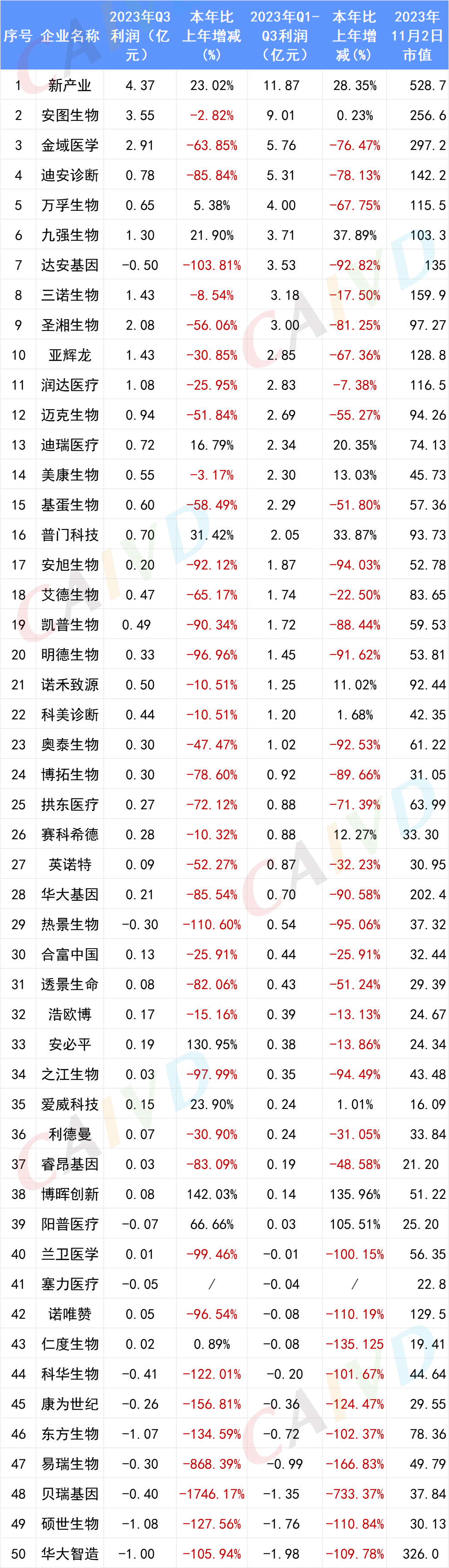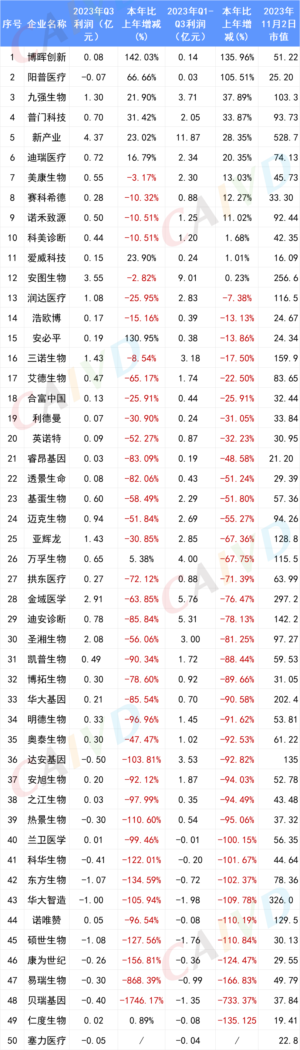 截止2023年10月31日,已有50家IVD上市企业公布了其Q3的财报,从已公布的数据来看,前三季度总营收前十的企业分别为:迪安诊断营收102.92亿元、润达医疗营收68.90亿元、金域医学营收63.10亿元、安图生物营收32.42亿元、华大基因营收31.43亿元、三诺生物营收30.35亿元、新产业营收29.08亿元、华大智造营收22.04亿元、迈克生物营收21.15亿元、万孚生物营收20.04亿元。 前三季度总营收表: 按总营收排名(滑动浏览) 从整体Q3财报数据来看,只有11家企业(22%)的前三季度总营收相较于去年同期增长为正,分别为:博晖创新总营收8.06亿元,同比增加34.93%,迪瑞医疗总营收10.49亿元,同比增加30.69%,新产业总营收29.08亿元,同比增加26.62%,赛科希德总营收2.04亿元,同比增加24.37%,普门科技总营收8.09亿元,同比增加20.15%,艾德生物总营收7.08亿元,同比增加18.08%,浩欧博总营收3.00亿元,同比增加17.89%,九强生物总营收12.34亿元,同比增加9.93%,三诺生物总营收30.35亿元,同比增加6.46%,爱威科技总营收1.51亿元,同比增加0.19%。 前三季度营收表: 按增长率排名 博晖创新、迪瑞医疗、新产业、赛科希德、普门科技、九强生物、诺禾致源、爱威科技无论是前三季度的总营收还是归母净利润都实现了同比正向增长。安图生物、美康生物、阳普医疗、科美诊断虽然营收比去年同期有所下降,但是净利润却实现了正增长。艾德生物、浩欧博、三诺生物前三季度营收实现同比正增长,但是总利润却相较去年同期有所下降。 总利润表 利润表:按利润增长率排名 与体外诊断相关的上市企业前三季度营收情况如下:迈瑞医疗273.04亿元,归母净利润98.34亿元,万泰生物49.69亿元,归母净利润18.08亿元,中源协和12.02亿元,归母净利润1.33亿元,丽珠集团96.55亿元,归母净利润16.02亿元,理邦仪器23.37亿元,归母净利润3.39亿元,天瑞仪器6.16亿元,归母净利润-0.14亿元。 总表(按总营收排序) 注:诺辉健康、艾迪康、巨星医疗、华检医疗、康圣环球、云康集团、中生北控、美因基因、华康生物医学未公布其三季度财报。 供稿、编辑:雪墨 | 校对:甜宝 | 责编:小舟 |
