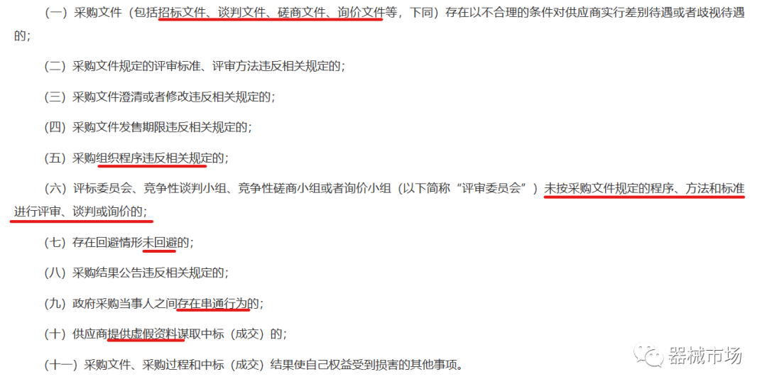 其中详细列举出【供应商质疑】的十一大类情况,所涉条款覆盖采购活动全过程,更充分考虑了采购程序及中标的合规性、评审方法/标准合理性等问题,并规定了投诉的时间和程序,是供应商维权的“保姆级”教程。