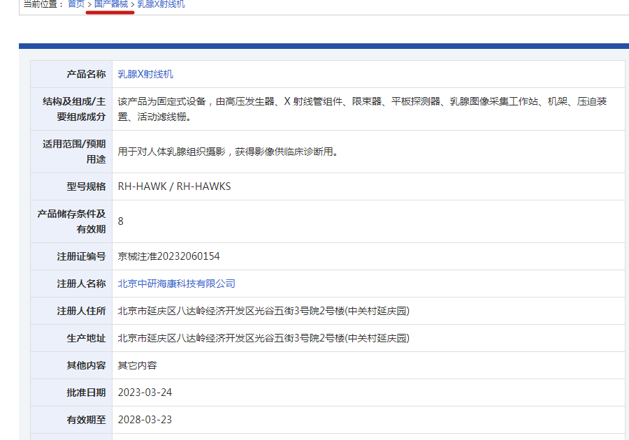 在投标过程中,中研海康科技的产品被错误地认定为“进口产品”,与招标文件规定不符。然而,据公司官网介绍,中研海康是国内乳腺诊疗设备专家,其产品属于“国产器械”类别,符合招标要求。查询北京市药监局发现,旗下乳腺X线机也归属在“国产器械”类别。
