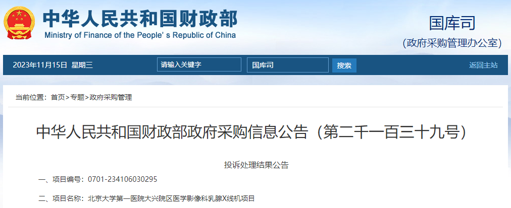 在11月13日国家财政部发布的《中华人民共和国财政部政府采购信息公告 (第二千一百三十九号)》中,北京大学第一医院大兴院区医学影像科乳腺X线机项目被投诉废标。投诉方是北京中研海康科技有限公司。供应商身份误认引发争议