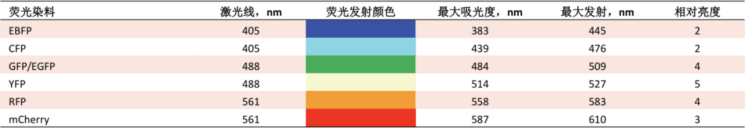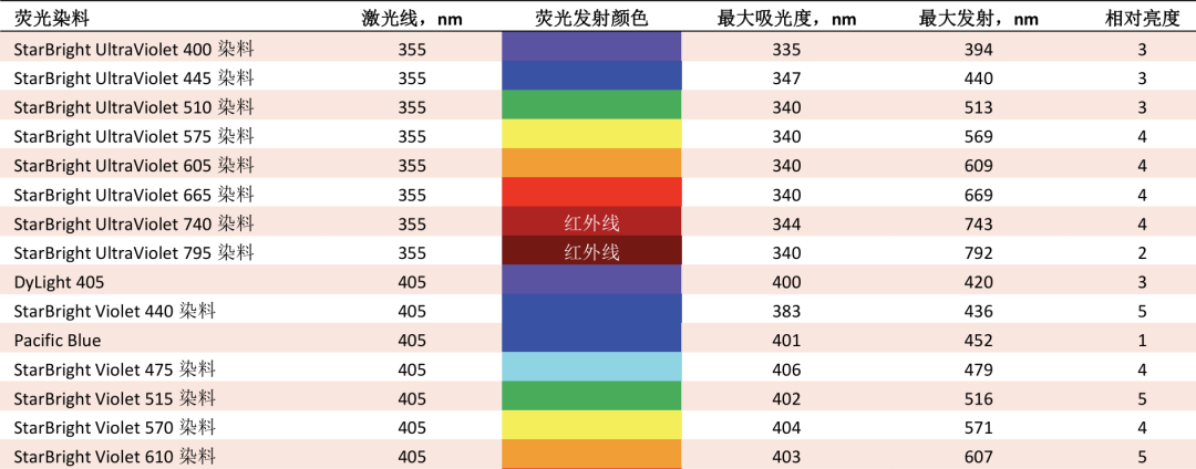 经过多年发展,目前市面上已有许多不同种类的流式荧光染料,例如单体染料、串联染料以及荧光蛋白等,并且可用的荧光染料种类仍在不断增加。 传统染料如FITC、PE、APC等单体染料已被使用多年,而新型单体染料也在逐步上市,如Bio-Rad StarBright系列染料等,其具有比传统染料更高的光稳定性和更亮的荧光。不断优化和拓展的单体染料可以匹配多色实验设计和多色流式细胞仪,极大降低多色流式实验的染料选择难度。 Axxx,Alexa Fluor;APC,别藻蓝蛋白;FITC,异硫氰酸荧光素;PE,藻红蛋白;PerCP,多甲藻素叶绿素蛋白。 与单体染料不同,串联染料则是将一种单体染料共价偶联到另外一种单体染料上,以FRET的形式激发,例如PE-cy5,PerCP-cy5.5、APC-cy7等。串联染料的出现降低了染料对仪器激光的配置要求,拓展了多色流式实验。但是串联染料依赖其FRET效率,不同厂家或不同批次的串联染料FRET效率会有差别。串联染料的稳定性较差,长期存放可能会导至两种单体染料间的偶联键断裂。上述这些都会对荧光补偿或光谱解析造成影响,在使用的时候需要注意。 Axxx,Alexa Fluor;APC,别藻蓝蛋白;Cy,花青;PE,藻红蛋白;PerCP,多甲藻素叶绿素蛋白。 常见荧光蛋白有GFP、YFP、mCherry、tdTomato等,目前已经成为科学领域了解蛋白质表达的不可或缺的工具,通常共表达或表达为与目标蛋白的融合体。在流式实验中使用荧光蛋白可以定量活细胞中的细胞内标记物,并在这个过程中无需透化细胞膜。 CFP,青色荧光蛋白;EBFP,增强的蓝色荧光蛋白;EGFP,增强的绿色荧光蛋白;GFP,绿色荧光蛋白;RFP,红色荧光蛋白;YFP,黄色荧光 由于不同的荧光染料亮度不同,在选择时,应遵循“强弱搭配”原则,例如:低密度表达的抗原应尽量选择亮度更高的荧光染料。