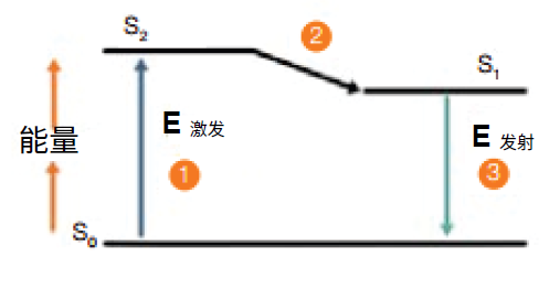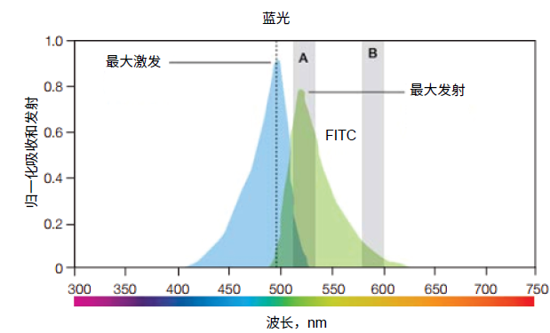 细胞上标记的荧光染料在流式细胞仪中被激光激发,而激发和发射的过程都伴随着能量的改变。当荧光团吸收光时,其电子会被激发,并从静止状态(S0,图1)跃迁到最大能级,称为激发电子单重态(S2)。对于每个荧光团,此转换所需的能量不同。激发态的持续时间取决于荧光染料,通常持续1-10ns。然后,荧光染料发生构象变化,电子下降到称为电子单重态(S1)的更低、更稳定的能级,在此过程中一部分吸收的能量作为热量被释放。电子随后回到其静止状态(S0),释放出剩余的能量(E发射)作为荧光。对于单个荧光团,此循环可以重复数千次,从而可以回收荧光团,进而放大信号。 由于激发荧光染料的能量比其发射出的光的能量高,所以任何荧光染料的发射波长都比其激发波长更长,因此可对应于电磁光谱上不同的颜色。 在激发光的峰值处称为最大激发波长,在该波长可以激发出最强的荧光;在发射光的峰值称为最大发射波长,在该波长可以收集到最强的荧光信号。例如FITC染料,通常使用接近FITC的490nm吸收峰的488nm蓝色激光来激发该荧光团。FITC发出475nm至650nm的荧光,在525nm处达到峰值,落在绿色光谱内。 流式细胞仪的滤光片设置决定染料检测的信号值,如图2中,在A区域可以收集到最强的发射光信号,而在B区域只能收集到很弱的发射光信号。 图2 FITC荧光光谱:蓝色为激发光,绿色为发射光。在A区域可以收集到最强的发射光信号,在B区域则只能收集到很弱的发射光信号。