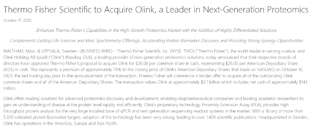 日前,赛默飞世尔科技和蛋白质组学巨头Olink同时宣布,各自的董事会已批准赛默飞世尔以每股普通股26.00美元现金收购Olink的提议,相当于每股美国存托股票(ADS)现金26.00美元,引起业界一片关注。 两个看点,一个是强强联手对蛋白质组学发展的影响,二是此次溢价收购超74%。赛默飞将开始收购所有已发行的Olink普通股和所有美国存托股票。该交易对Olink的价值约为31亿美元,其中包括约1.43亿美元的净现金。 来源:药渡 巨头Olink致力于突破蛋白检测在“多重能力/特异性”、“灵敏度”和“检测通量”等方面的综合瓶颈,以帮助蛋白标志物的发现、药物研发、转化医学。其主要技术是PEA(邻位延伸分析),为市场上安装的大量qPCR和下一代测序读出系统提供高通量蛋白质分析。拥有超过5300个经过验证的蛋白质生物标志物靶点的文库,Olink还验证出系列Panel,可以在1-6µl体液中精确检测15-5300种生物标志物。其覆盖100%主要信号通路,实现生物学意义上的超灵敏无偏靶向蛋白组学,特别是对传统方法未能解决的血浆血清等样本。 无疑,赛默飞世尔看中的是这些革命性的突破。而其本身业务覆盖包括测序仪、PCR系统、培养基等用于科学研究的生命科学仪器/试剂;色谱/质谱/电镜等分析仪器;临床诊断产品;还有各类耗材、反应器、研究服务等。此次的并购意在使其领先的质谱和生命名科学平台进行互补,有利于加速发现和科学突破。 根据2022年财报,Olink营收达到1.398亿美元,增长率高达47%。根据此次收购案,预测收购后的2024年实现超过2亿美元的收入,增长将达到15%左右。在收购的第一个完整年份,该交易预计将稀释调整后的每股收益0.17美元。这些营收数据呈现良好预期,不过最重要的还是在业务上的协 过去五年,Olink从2019年的4600万美元增至2022年的1.4亿美元,预期今年将近2亿美元。但Olink的毛利率并不高,与Illumina(约 70%)和 10x Genomics(80%)尚有差距,需转向“剃须刀和刀片”模式,以提高利润率;还需要扩大产品规模,实现产品增长。 即使这样,单纯依靠分析服务模式和产品,长期并不能维持其再市场的龙头地位。因为身处创新技术赛道,随时又被颠覆和超越的可能,并非稳固,即依靠关键性技术占据市场仍不够,需展开更多合作。通过与基础研究、药物研发、临床研究的合作,不断开发新的蛋白质生物标志物解决方案,加速生物学见解更新,并且重视与科学界的合作,例如英国UKB-PPP,提高对疾病潜在机制的理解,加速对治疗药物的开发。 除此之外,并购收购等商业活动也是关键一环。例如2019年被Summa Equity收购,2021首募获得研究和服务的现今流,2020年并购Agrisera延申至植物和藻类,以及如今的并入赛默飞世尔。毫无疑问,借助赛默飞全球影响力,可以显著扩大Olink的业务并推动渗透到全球各领域,这对持续贡献营收增长是确定性的好处。 我们直接从此次合作的交汇点讲起,质谱技术一直是蛋白组学发展的重要支持,而赛默飞在质谱方面,自2005年推出第一台 Orbitrap 高分辨率精确质谱仪之后,持续提升了其分辨率、灵敏度、特异性和速度。特别是在今年6月份,赛默飞推出了Orbitrap Astral 质谱仪,全面升级,技术达到了巅峰。无与伦比的灵敏度、动态范围和速度、精确定量等组合。 然而,质谱和PEA毕竟是两种不同的蛋白组学实施路径,赛默飞也并非打算二者互掐,而是收购后让二者各自发展。Olink将成为赛默飞生命科学解决方案部门的一部分,包含PCR仪、测序仪等;而Orbitrap质谱仪是在另一个分析仪器部分里。凭借各自的优点,充分发展,互相借鉴,达到良性竞争。 另外,近些年赛默飞所服务的生物技术客户由于资金的短缺,对生命科学产品需求疲乏,为积极应对这个问题,收购Olink这种重量级的技术互补股,来加快蛋白发现和检测,显得也迫切。有助于提升药物发现速率,后者多种疾病的关键标志物的蛋白发现和检测,自然有助于药物发现和开发。总体而言,在原有质谱的优势基础上,引入PEA不同思维的技术平台进来,充分竞争下,均有利于蛋白组学的发展。 以Olink的技术沉淀看,其生物制药和学术机构数量已超过850 家。截至2023年8 月,引用PEA技术所发表的文章数量超过1,363 篇。明确的科学实用性不断推动客户的快速采用和增长。事实上,蛋白质比DNA更相关但也更复杂,除了灵敏度、特异性、动态范围,还有通量、精度和再现性等问题。因此Olink能做到这个份上,已实属难得,当然这也是其成为国际龙头的原因之一。 基于此,Olink宣称其拥有从最广泛的高复杂发现到更具针对性的中复杂研究,再到后期低复杂的临床试验和诊断的完整产品,这个过程覆盖着350亿美元的潜在市场机会。结合其领先的特异性和高动态范围及灵敏度,具备良好表现的蛋白质组学研究。这种宣称破局分量,真实度极强,也许这也是默赛飞看中的。 无论是靠自身质谱扩大蛋白质组学,还是引入Olink这条鲇鱼,对默赛飞来说是百里无害,唯一不利的就是这次溢价收购,可能慢一点回本。 强强联合之下,赛默飞在Orbitrap质谱平台的基础之上,通过收购Olink而拥有PEA,在两张王牌压舱下,对蛋白组学自然更有信心。 作为下一个科学前沿,如上文所述,其比DNA更相关,这意味者未来具备更广阔的前景。同时其面临的难关和挑战也更难,灵敏度、特异性、动态范围、通量、精度和再现性等等,均需一一克服、升级。 基因组学尚且在艰苦奋斗中,更何况蛋白组学呢