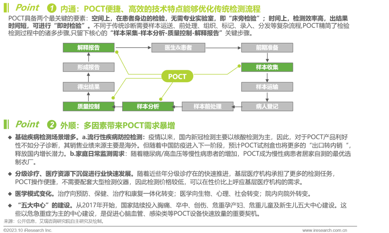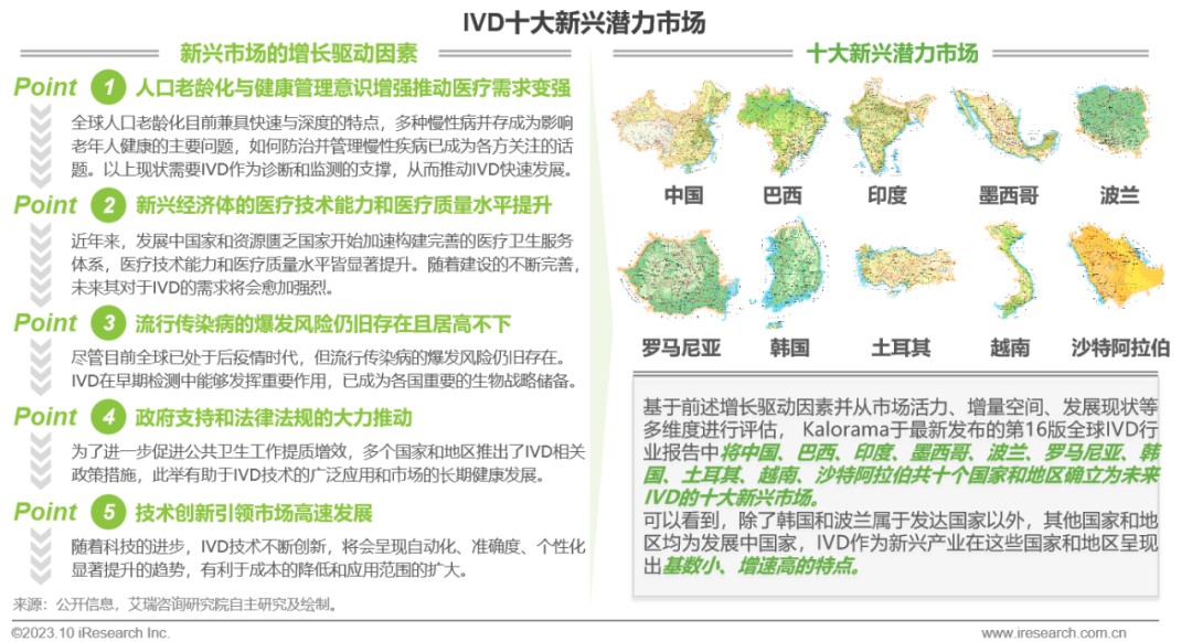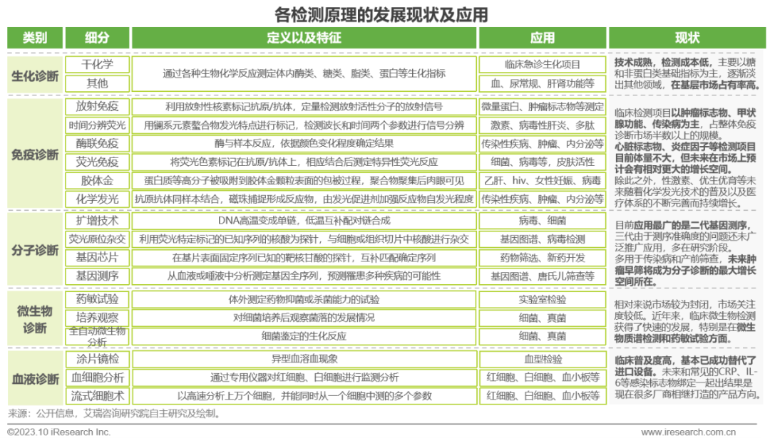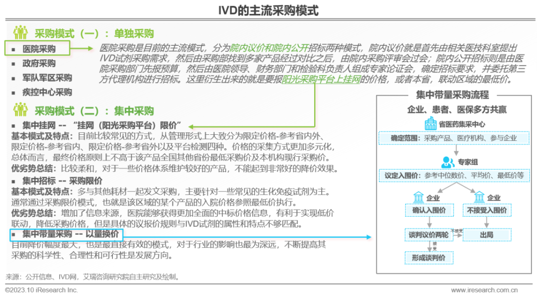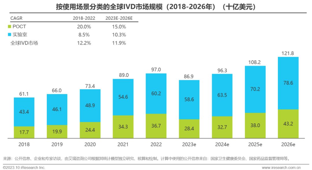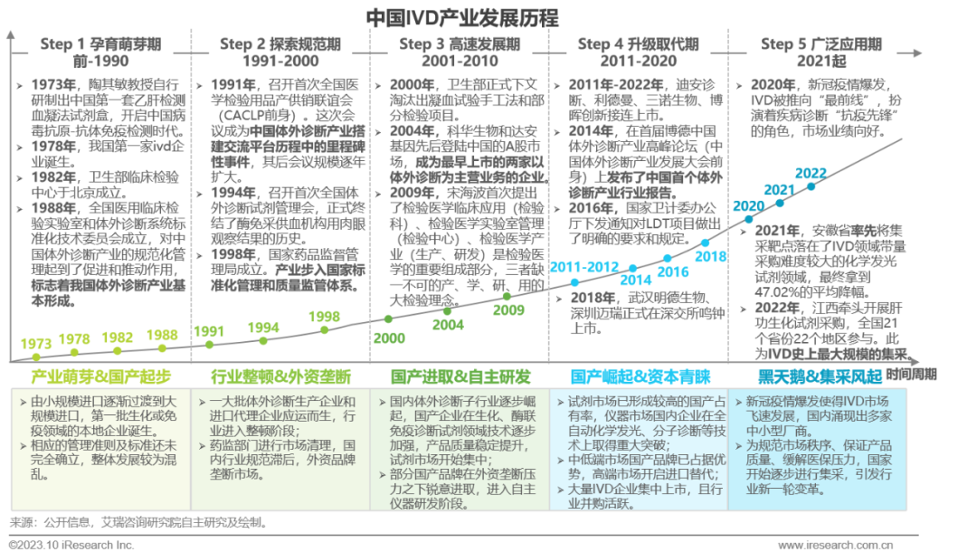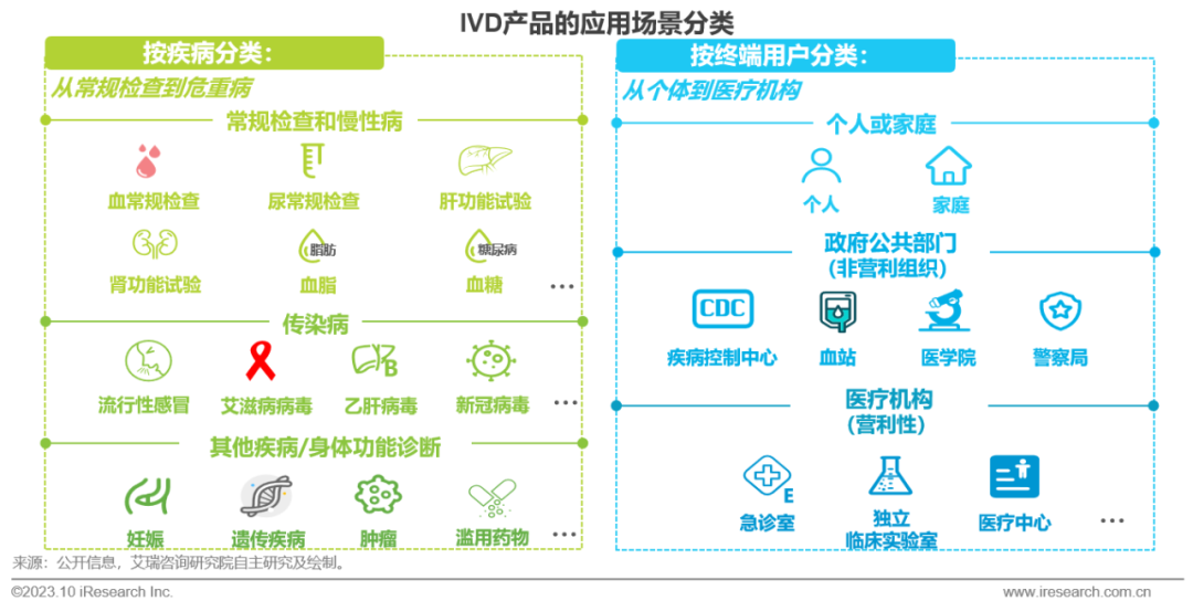 体外诊断IVD丨研究报告 市场概述: 概念剖析:体外诊断(IVD)指在体外检测来自人体的样本(血液、体液、组织等),以获取临床诊断信息,诊断疾病或身体功能。被誉为“医生的眼睛”,是现代检验医学的重要构成部分。 类别梳理:根据检验方法或技术,IVD产品可分为免疫诊断、生化诊断、分子诊断、血液诊断、微生物诊断五个主要类别。根据使用场景,IVD产品可分为POCT和实验室Lab两类。 市场规模:2022年全球IVD行业规模970亿美元,预计未来四年全球IVD行业规模将以11.9%的CAGR增长,2026年将超1200亿美元。 热点赛道: 化学发光:化学发光是目前在免疫诊断中最为先进的技术手段。应用项目包括肿瘤标识物、甲功、传染病、激素、心脏标识物等。2022年全球化学发光市场规模约147亿美元,占免疫诊断市场的33.3%。 POCT:POCT主要应用于血糖检测类、血气电解质类、心血管检测类、感染性疾病类、妊娠检测类和其他检测类(包括血常规等)。2022年全球POCT市场规模达到367亿美元,且将因疫情因素于2023年面临回调,其后以15%-20%的增速持续上涨。 PCR:PCR聚合酶链式反应技术是分子诊断技术中应用最广的技术。如今在感染性疾病、肿瘤、遗传病等医疗领域获得了广泛应用。2022年全球分子诊断市场规模达到184亿美元,预计于2026年达到375亿美元。 集采风起: 集采原因:技耗分离后,决定最终收费高低的,是体外诊断试剂集采价格的高低。故IVD集采承担着缓解医保压力和规范化市场秩序两大任务。 现存难点:各厂家的检测系统一致性难以得到保证,会对临床判断产生很大的不良影响;化学发光的仪器与试剂多为强绑定关系,若强行集采,医院将会造成大额成本支出。 变化与破局:竞争格局方面,各厂商业绩表现同集采中标情况呈现强相关态势。商业模式方面,集采使得可供医疗机构与厂商、代理商重新分配的费用得到控制与切割。企业破局主要方式包括:前移应用市场至C端、加大对全流程服务的重视程度、布局上游提升原材料的议价能力,把控和代理商之间的成本分配、探寻海外市场机会等。 趋势洞察: 发展中国家IVD市场呈现基数小、增速高的特点,将成为未来国内IVD厂商的出海主方向。 TLA成为IVD技术自动化水平提升的重要基石,国内TLA企业有望凭借高性价比与强兼容性迎来发展新机遇。 IVD是一种医学检测方法,在现代医学中发挥着重要作用 体外诊断(IVD)是一种医学检测方法,它在体外检测来自人体的样本(血液、体液、组织等),以获取临床诊断信息,诊断疾病或身体功能。通过IVD试剂与人体样本之间的反应,可以给出定性或定量诊断,并与正常值进行比较,以判断患者的生理状态。体外诊断在医疗领域被誉为“医生的眼睛”,是现代检验医学的重要构成部分,在临床应用中贯穿了疾病预防、初步诊断、 治疗方案选择、疗效评价等疾病治疗的全过程,能够为医生提供大量有用的临床诊断信息,越来越成为人类疾病诊断、治疗的重要组成部分,在现代医学疾病诊断中发挥着重要作用。 中国IVD行业发展回顾 经过近40年的发展,中国IVD产业正处于广泛应用阶段 随着民众对于IVD检验方法及产品的接受度不断提高、政府对于市场的规范力度逐步增强,我国IVD行业已历经孕育萌芽期、探索规范期、高速发展期、升级取代期四个主要阶段,目前正处于广泛应用期,长期发展态势喜人。 IVD产品的应用 IVD产品应用广泛,覆盖从常规检查到危重病、从个人到医疗机构全场景 IVD产品的应用范围非常广泛,不仅可以用于诊断各种疾病,同时还能够在生命科学研究、体育医学、环境监测、食品安全等领域发挥重要作用。回归于医疗领域,通常情况下,可以将IVD产品根据疾病类型以及终端用户的类型进行两种不同的分类。基于疾病,IVD产品可以覆盖从常规检查到危重病等多种情况,包括常规检查和慢性病、传染病、妊娠、遗传疾病、肿瘤等。基于终端用户,IVD产品可以覆盖从个体到医疗机构等多种场景,包括个人、非营利组织(如CDC、血站、学院等)和医疗机构(主要是医院和实验室)。综合而言,IVD产品辐射了临床的各个阶段,贯穿于初步诊断、治疗方案选择、有效性评价、确诊治愈等疾病治疗全过程,且随着研究的深入与技术的进步,未来IVD产品将会有更多的应用可能性。 按检测原理分类 免疫诊断与分子诊断技术更迭速度快、应用广泛,广受市场关注 根据前文所述,IVD可根据检测原理大致分为五类。其中生化诊断目前技术较为成熟,临床应用广泛;免疫诊断市场占比最高,未来将由化学发光引领新一轮技术革新与体量增长;分子诊断近年来增速较快,主要以二代基因测序为主,在肿瘤早筛领域极具发展空间;微生物诊断与血液诊断占比较低,增长空间有限。 全球IVD的市场规模:按检测原理划分 免疫诊断是目前IVD市场最大的细分市场,分子诊断保持稳步增长 整体而言,全球IVD市场规模增长速度喜人,目前已达970亿美元,虽然随着新冠疫情基本结束、疫情防控全面放开等因素影响,IVD市场会于2023年面临一定程度的回调,但仍有望于2025年突破1000亿美元。细分来看,免疫诊断可应用于传染病、内分泌、肿瘤、药物检测等领域,是目前IVD市场中最大的细分市场,占比高达45.5%;另外分子诊断在PCR技术的加持之下,将持续保持高速增长,预计会在5年左右同免疫诊断呈现“分庭抗礼”的局面。 按使用场景分类 Lab和POCT术业有专攻,分别解