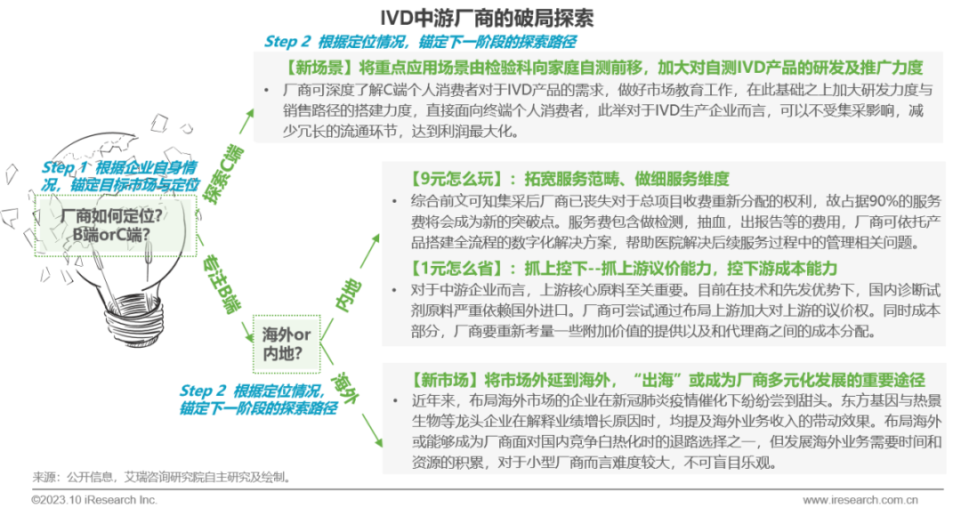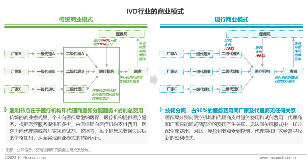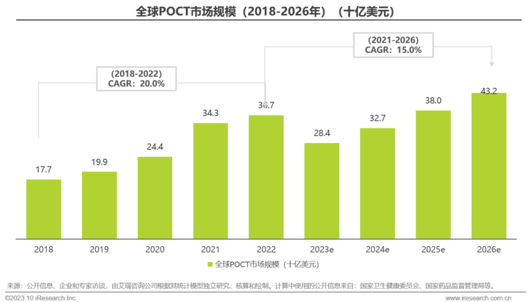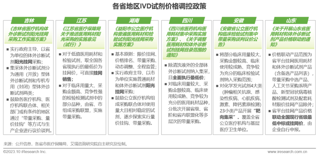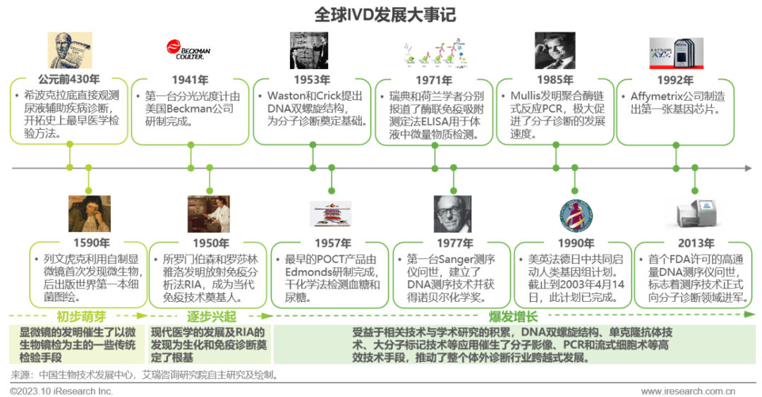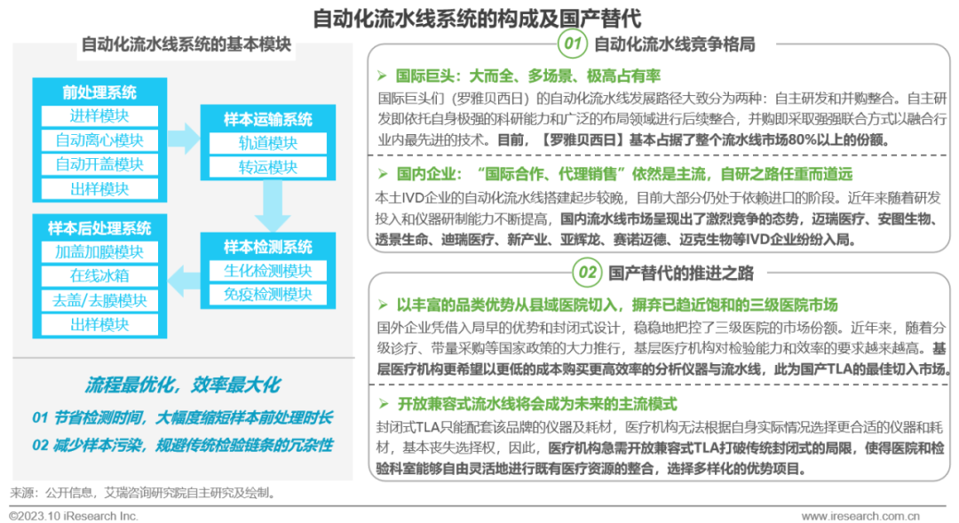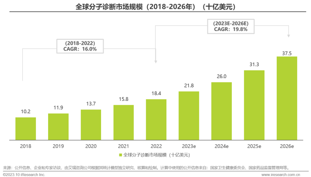 体外诊断IVD丨研究报告 市场概述: 概念剖析:体外诊断(IVD)指在体外检测来自人体的样本(血液、体液、组织等),以获取临床诊断信息,诊断疾病或身体功能。被誉为“医生的眼睛”,是现代检验医学的重要构成部分。 类别梳理:根据检验方法或技术,IVD产品可分为免疫诊断、生化诊断、分子诊断、血液诊断、微生物诊断五个主要类别。根据使用场景,IVD产品可分为POCT和实验室Lab两类。 市场规模:2022年全球IVD行业规模970亿美元,预计未来四年全球IVD行业规模将以11.9%的CAGR增长,2026年将超1200亿美元。 热点赛道: 化学发光:化学发光是目前在免疫诊断中最为先进的技术手段。应用项目包括肿瘤标识物、甲功、传染病、激素、心脏标识物等。2022年全球化学发光市场规模约147亿美元,占免疫诊断市场的33.3%。 POCT:POCT主要应用于血糖检测类、血气电解质类、心血管检测类、感染性疾病类、妊娠检测类和其他检测类(包括血常规等)。2022年全球POCT市场规模达到367亿美元,且将因疫情因素于2023年面临回调,其后以15%-20%的增速持续上涨。 PCR:PCR聚合酶链式反应技术是分子诊断技术中应用最广的技术。如今在感染性疾病、肿瘤、遗传病等医疗领域获得了广泛应用。2022年全球分子诊断市场规模达到184亿美元,预计于2026年达到375亿美元。 集采风起: 集采原因:技耗分离后,决定最终收费高低的,是体外诊断试剂集采价格的高低。故IVD集采承担着缓解医保压力和规范化市场秩序两大任务。 现存难点:各厂家的检测系统一致性难以得到保证,会对临床判断产生很大的不良影响;化学发光的仪器与试剂多为强绑定关系,若强行集采,医院将会造成大额成本支出。 变化与破局:竞争格局方面,各厂商业绩表现同集采中标情况呈现强相关态势。商业模式方面,集采使得可供医疗机构与厂商、代理商重新分配的费用得到控制与切割。企业破局主要方式包括:前移应用市场至C端、加大对全流程服务的重视程度、布局上游提升原材料的议价能力,把控和代理商之间的成本分配、探寻海外市场机会等。 趋势洞察: 发展中国家IVD市场呈现基数小、增速高的特点,将成为未来国内IVD厂商的出海主方向。 TLA成为IVD技术自动化水平提升的重要基石,国内TLA企业有望凭借高性价比与强兼容性迎来发展新机遇。 IVD是一种医学检测方法,在现代医学中发挥着重要作用 体外诊断(IVD)是一种医学检测方法,它在体外检测来自人体的样本(血液、体液、组织等),以获取临床诊断信息,诊断疾病或身体功能。通过IVD试剂与人体样本之间的反应,可以给出定性或定量诊断,并与正常值进行比较,以判断患者的生理状态。体外诊断在医疗领域被誉为“医生的眼睛”,是现代检验医学的重要构成部分,在临床应用中贯穿了疾病预防、初步诊断、 治疗方案选择、疗效评价等疾病治疗的全过程,能够为医生提供大量有用的临床诊断信息,越来越成为人类疾病诊断、治疗的重要组成部分,在现代医学疾病诊断中发挥着重要作用。 中国IVD行业发展回顾 经过近40年的发展,中国IVD产业正处于广泛应用阶段 随着民众对于IVD检验方法及产品的接受度不断提高、政府对于市场的规范力度逐步增强,我国IVD行业已历经孕育萌芽期、探索规范期、高速发展期、升级取代期四个主要阶段,目前正处于广泛应用期,长期发展态势喜人。 IVD产品的应用 IVD产品应用广泛,覆盖从常规检查到危重病、从个人到医疗机构全场景 IVD产品的应用范围非常广泛,不仅可以用于诊断各种疾病,同时还能够在生命科学研究、体育医学、环境监测、食品安全等领域发挥重要作用。回归于医疗领域,通常情况下,可以将IVD产品根据疾病类型以及终端用户的类型进行两种不同的分类。基于疾病,IVD产品可以覆盖从常规检查到危重病等多种情况,包括常规检查和慢性病、传染病、妊娠、遗传疾病、肿瘤等。基于终端用户,IVD产品可以覆盖从个体到医疗机构等多种场景,包括个人、非营利组织(如CDC、血站、学院等)和医疗机构(主要是医院和实验室)。综合而言,IVD产品辐射了临床的各个阶段,贯穿于初步诊断、治疗方案选择、有效性评价、确诊治愈等疾病治疗全过程,且随着研究的深入与技术的进步,未来IVD产品将会有更多的应用可能性。 按检测原理分类 免疫诊断与分子诊断技术更迭速度快、应用广泛,广受市场关注 根据前文所述,IVD可根据检测原理大致分为五类。其中生化诊断目前技术较为成熟,临床应用广泛;免疫诊断市场占比最高,未来将由化学发光引领新一轮技术革新与体量增长;分子诊断近年来增速较快,主要以二代基因测序为主,在肿瘤早筛领域极具发展空间;微生物诊断与血液诊断占比较低,增长空间有限。 全球IVD的市场规模:按检测原理划分 免疫诊断是目前IVD市场最大的细分市场,分子诊断保持稳步增长 整体而言,全球IVD市场规模增长速度喜人,目前已达970亿美元,虽然随着新冠疫情基本结束、疫情防控全面放开等因素影响,IVD市场会于2023年面临一定程度的回调,但仍有望于2025年突破1000亿美元。细分来看,免疫诊断可应用于传染病、内分泌、肿瘤、药物检测等领域,是目前IVD市场中最大的细分市场,占比高达45.5%;另外分子诊断在PCR技术的加持之下,将持续保持高速增长,预计会在5年左右同免疫诊断呈现“分庭抗礼”的局面。 按使用场景分类 Lab和POCT术业有专攻,分别解