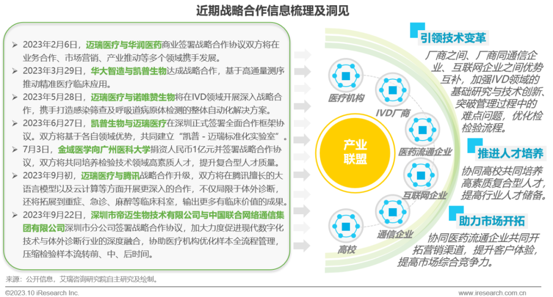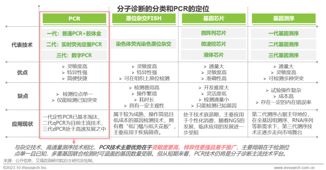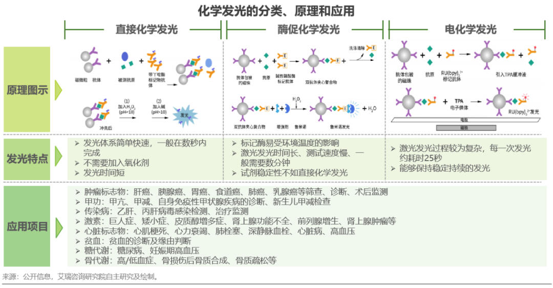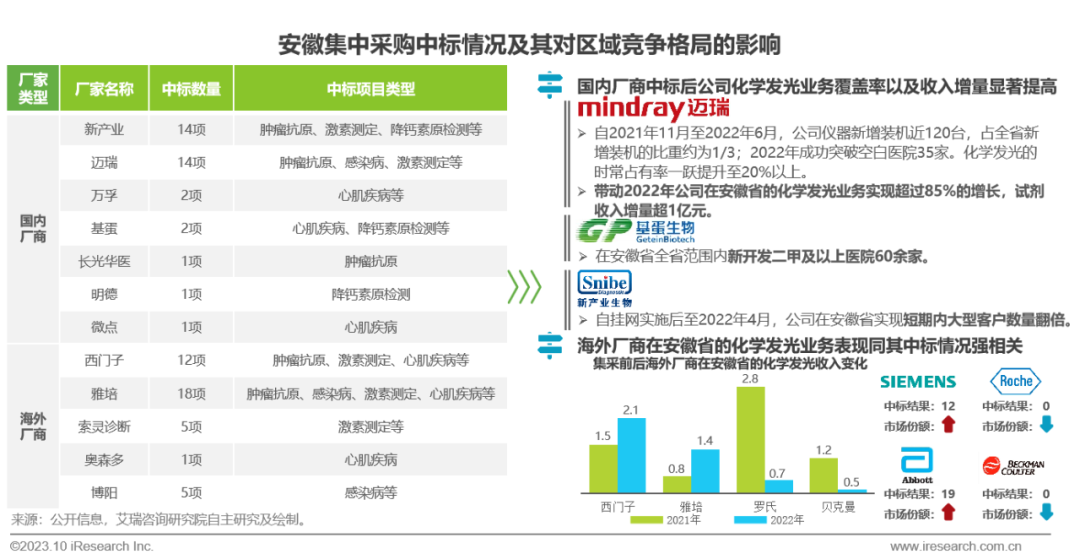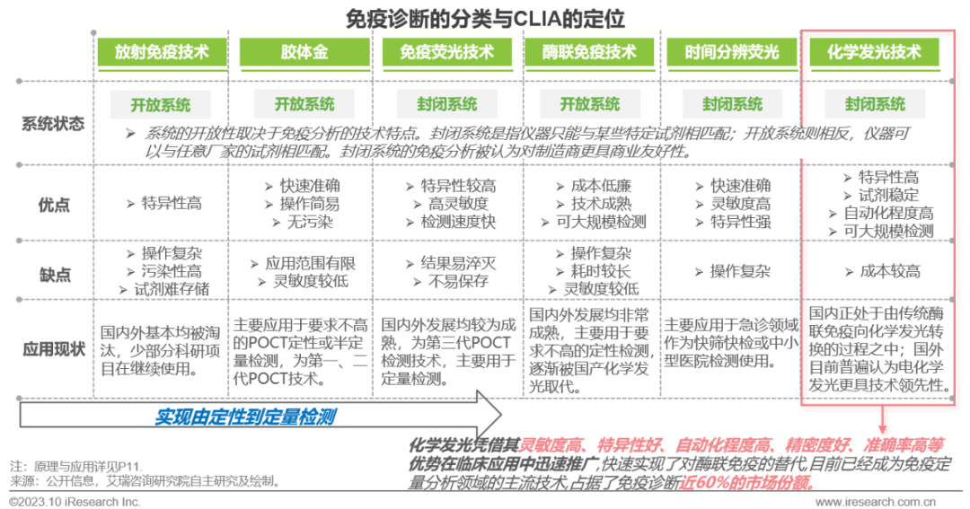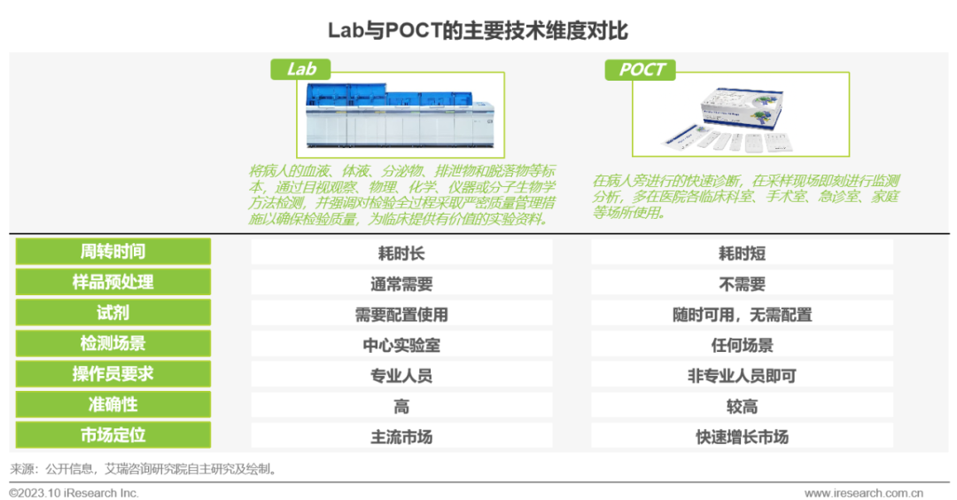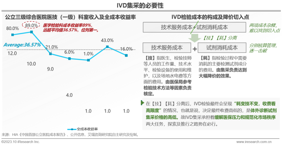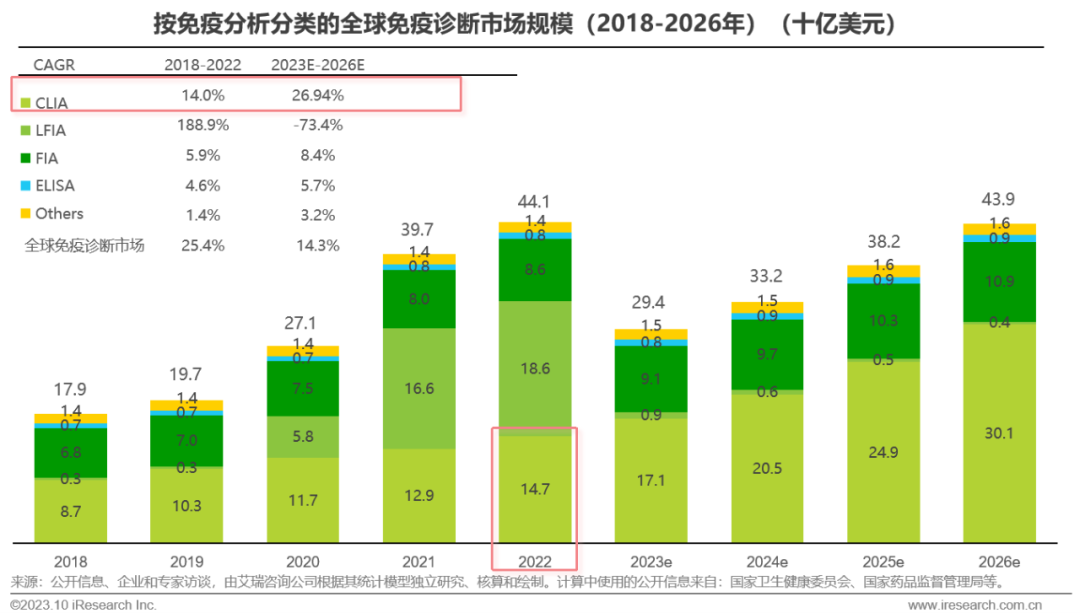 体外诊断IVD丨研究报告 市场概述: 概念剖析:体外诊断(IVD)指在体外检测来自人体的样本(血液、体液、组织等),以获取临床诊断信息,诊断疾病或身体功能。被誉为“医生的眼睛”,是现代检验医学的重要构成部分。 类别梳理:根据检验方法或技术,IVD产品可分为免疫诊断、生化诊断、分子诊断、血液诊断、微生物诊断五个主要类别。根据使用场景,IVD产品可分为POCT和实验室Lab两类。 市场规模:2022年全球IVD行业规模970亿美元,预计未来四年全球IVD行业规模将以11.9%的CAGR增长,2026年将超1200亿美元。 热点赛道: 化学发光:化学发光是目前在免疫诊断中最为先进的技术手段。应用项目包括肿瘤标识物、甲功、传染病、激素、心脏标识物等。2022年全球化学发光市场规模约147亿美元,占免疫诊断市场的33.3%。 POCT:POCT主要应用于血糖检测类、血气电解质类、心血管检测类、感染性疾病类、妊娠检测类和其他检测类(包括血常规等)。2022年全球POCT市场规模达到367亿美元,且将因疫情因素于2023年面临回调,其后以15%-20%的增速持续上涨。 PCR:PCR聚合酶链式反应技术是分子诊断技术中应用最广的技术。如今在感染性疾病、肿瘤、遗传病等医疗领域获得了广泛应用。2022年全球分子诊断市场规模达到184亿美元,预计于2026年达到375亿美元。 集采风起: 集采原因:技耗分离后,决定最终收费高低的,是体外诊断试剂集采价格的高低。故IVD集采承担着缓解医保压力和规范化市场秩序两大任务。 现存难点:各厂家的检测系统一致性难以得到保证,会对临床判断产生很大的不良影响;化学发光的仪器与试剂多为强绑定关系,若强行集采,医院将会造成大额成本支出。 变化与破局:竞争格局方面,各厂商业绩表现同集采中标情况呈现强相关态势。商业模式方面,集采使得可供医疗机构与厂商、代理商重新分配的费用得到控制与切割。企业破局主要方式包括:前移应用市场至C端、加大对全流程服务的重视程度、布局上游提升原材料的议价能力,把控和代理商之间的成本分配、探寻海外市场机会等。 趋势洞察: 发展中国家IVD市场呈现基数小、增速高的特点,将成为未来国内IVD厂商的出海主方向。 TLA成为IVD技术自动化水平提升的重要基石,国内TLA企业有望凭借高性价比与强兼容性迎来发展新机遇。 IVD是一种医学检测方法,在现代医学中发挥着重要作用 体外诊断(IVD)是一种医学检测方法,它在体外检测来自人体的样本(血液、体液、组织等),以获取临床诊断信息,诊断疾病或身体功能。通过IVD试剂与人体样本之间的反应,可以给出定性或定量诊断,并与正常值进行比较,以判断患者的生理状态。体外诊断在医疗领域被誉为“医生的眼睛”,是现代检验医学的重要构成部分,在临床应用中贯穿了疾病预防、初步诊断、 治疗方案选择、疗效评价等疾病治疗的全过程,能够为医生提供大量有用的临床诊断信息,越来越成为人类疾病诊断、治疗的重要组成部分,在现代医学疾病诊断中发挥着重要作用。 中国IVD行业发展回顾 经过近40年的发展,中国IVD产业正处于广泛应用阶段 随着民众对于IVD检验方法及产品的接受度不断提高、政府对于市场的规范力度逐步增强,我国IVD行业已历经孕育萌芽期、探索规范期、高速发展期、升级取代期四个主要阶段,目前正处于广泛应用期,长期发展态势喜人。 IVD产品的应用 IVD产品应用广泛,覆盖从常规检查到危重病、从个人到医疗机构全场景 IVD产品的应用范围非常广泛,不仅可以用于诊断各种疾病,同时还能够在生命科学研究、体育医学、环境监测、食品安全等领域发挥重要作用。回归于医疗领域,通常情况下,可以将IVD产品根据疾病类型以及终端用户的类型进行两种不同的分类。基于疾病,IVD产品可以覆盖从常规检查到危重病等多种情况,包括常规检查和慢性病、传染病、妊娠、遗传疾病、肿瘤等。基于终端用户,IVD产品可以覆盖从个体到医疗机构等多种场景,包括个人、非营利组织(如CDC、血站、学院等)和医疗机构(主要是医院和实验室)。综合而言,IVD产品辐射了临床的各个阶段,贯穿于初步诊断、治疗方案选择、有效性评价、确诊治愈等疾病治疗全过程,且随着研究的深入与技术的进步,未来IVD产品将会有更多的应用可能性。 按检测原理分类 免疫诊断与分子诊断技术更迭速度快、应用广泛,广受市场关注 根据前文所述,IVD可根据检测原理大致分为五类。其中生化诊断目前技术较为成熟,临床应用广泛;免疫诊断市场占比最高,未来将由化学发光引领新一轮技术革新与体量增长;分子诊断近年来增速较快,主要以二代基因测序为主,在肿瘤早筛领域极具发展空间;微生物诊断与血液诊断占比较低,增长空间有限。 全球IVD的市场规模:按检测原理划分 免疫诊断是目前IVD市场最大的细分市场,分子诊断保持稳步增长 整体而言,全球IVD市场规模增长速度喜人,目前已达970亿美元,虽然随着新冠疫情基本结束、疫情防控全面放开等因素影响,IVD市场会于2023年面临一定程度的回调,但仍有望于2025年突破1000亿美元。细分来看,免疫诊断可应用于传染病、内分泌、肿瘤、药物检测等领域,是目前IVD市场中最大的细分市场,占比高达45.5%;另外分子诊断在PCR技术的加持之下,将持续保持高速增长,预计会在5年左右同免疫诊断呈现“分庭抗礼”的局面。 按使用场景分类 Lab和POCT术业有专攻,分别解
