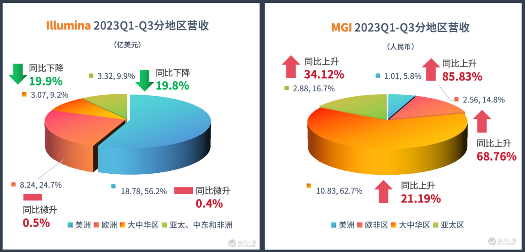 在全球主要市场的营收分布中,Illumina与MGI的区域划分略有不同,Illumina将全球市场分为美洲、欧洲、大中华区、AMEA(亚太-中东-非洲);MGI将全球市场分为美洲、欧非区、大中华区、亚太区。这体现了双方主要战场的差异。 Illumina的主战场毫无疑问在欧美市场,其中美洲本土、欧洲的Q1-Q3营收同比持平;而大中华区、AMEA同比大幅下跌近20%; 而MGI在全球四大核心区域同比全线大幅增长,中国大陆及港澳台地区上升21.19%、亚太区上升34.12%、欧非区上升68.76%、美洲区上升85.83%。 如果两两比较,则更为直观。Illumina营收大幅下降的区域,正是MGI的主战场和近80%的营收来源;这表明在这些区域,Illumina正面临MGI强有力的挑战。 即使在Illumina欧美优势市场,MGI也依然取得了大幅增长,除基数尚小的原因外,也表明MGI的产品逐渐被欧美客户接受,这是MGI打开全球市场的关键讯号。