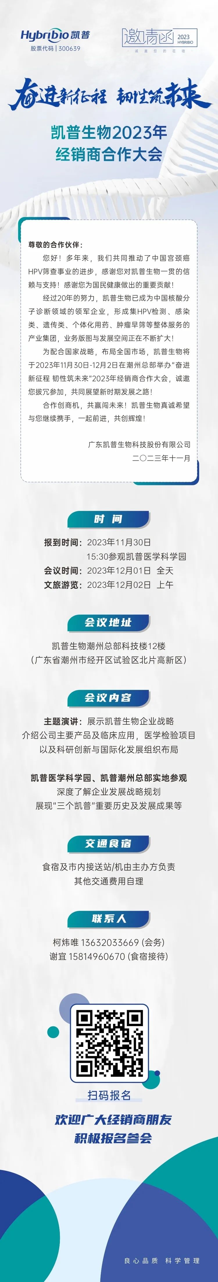 为了更好地为2024年开局谋划,凯普生物将于2023年11月30日-12月2日在潮州总部举办“奋进新征程 韧性筑未来”2023年经销商合作大会,诚邀新老经销商伙伴拔冗参加,共同展望新时期发展之路,合力开拓巨大市场!