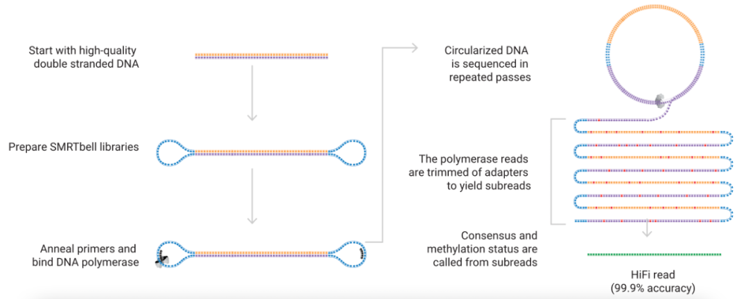 高错误率常被认为是三代测序技术的主要特征之一。不够准确的长读长测序,就像锋利而命中率不高的飞镖,破空而去,却射不中目标,不免令人失望。 然而近几年,情况似乎发生了变化。三代测序准确率有了明显的提升。它在科研界似乎从幕后走向台前,应用实例变多了,受到的关注也日渐增多。这其中发生了什么? > HiFi测序的诞生:一遍读不准,那就多读几遍咯 HiFi测序由PacBio公司开发,意思是High-Fidelity(高保真)测序。你可以认为是SMRT测序技术的进阶版。它兼具长读长和高准确率,也是目前正在推广和应用的、最具代表性的版本。 准确率之所以提升,主要是因为它采取了一种被称作Circular Consensus Sequencing (CCS)的测序模式。有人将CCS翻译为“环化共有序列”,听起来很唬人,但如果把两个词拆开来理解可就容易多了。 首先是Circular。在HiFi测序流程中,样品先被打断为一定长度的双链DNA分子(>10 kb)后,然后其两端被接上发卡结构的接头序列(Hairpin adapters)。两条链接续起来,构成哑铃形状,如下图所示。把它展开以后就是一个由DNA正链、反链和接头序列组成的环状分子。由此构建的文库叫做SMRTbell Library。 与Illumina和其他二代测序技术相似,SMRT测序过程是边合成边测序(Sequencing by synthesis),也就是说,以待测DNA为模板进行DNA复制,在合成新链的同时,通过检测新捕捉的核苷酸来确定DNA序列。HiFi测序的模板就是上述带有发卡接头的、环化了的DNA分子。由于两条链已经连接起来,DNA复制过程不存在断点,聚合酶能够在这个环状模板上跑完一遍又一遍,进行周而复始的滚环复制。这是CCS测序模式得以实现的基础。 SMRT测序技术本身的准确率不高,DNA聚合酶在环状模板上跑一次测得的序列准确率通常在90%以下。但由于测序错误的产生是随机的,这种错误可以用一个极其简单直接的方法来矫正,那就是:多跑几遍。 就好像是你有一群不聪明但很认真的孩子,你无法直接阅读一本书,而只能通过他们来间接获取关于这本书的信息。他们会向你逐字逐句地转述书的内容,但每个人都可能随机地在10-15%的字词上出错。 于是,通过比对、得到一致性序列,可以得到高准确率的测序结果。相当于让这些孩子围坐在一起讨论,所达成的共识(Consensus)部分,就可以认为是准确的。因为所有孩子在同一字词上犯错的概率极小。 如下图所示,当你有5个“孩子”,能够实现Q20(99%)以上的准确率,而当你有10个“孩子”,即在环状模板上跑10次(10 passes),准确率就能达到Q30(99.9%)。 听起来简单粗暴、量大管饱,但实现起来没那么容易。前文所说的,发卡接头将两条链接续起来后DNA连续复制是理想状况,实际上,导至DNA复制过程的中断另有其他因素,比如样品DNA本身。DNA的损伤会让聚合酶在复制中途脱落,从而使测序过程中断。因此,CCS测序模式非常依赖于样品DNA质量。需要预先筛选出高质量DNA分子,最大程度地减少受损DNA的比例,才能有效地实现高准确率测序。 另外,pass次数不可能是无限的,测序准确率的提升也是有天花板的。在环状模板上周而复始地复制,对于DNA聚合酶来说是连轴转的苦力活。它很容易就过劳死了,不可能在那个环上工作到天荒地老。 > 纳米孔测序的进阶:工欲善其事,必先利其器 与PacBio HiFi测序的“电梯直达”式的进阶之路不同,ONT提高纳米孔测序准确率的道路要显得曲折一些,更像是阶梯式的螺旋上升。 在发展纳米孔测序技术的早期阶段,ONT也曾采取与CCS相似的方法。他们也在样品DNA上连接发卡接头,只不过是其中的一端,而不是两端。这样将两条链串联起来以后,马达蛋白先牵引模板链通过纳米孔,发卡接头和另一条互补链紧随其后,从而一次完成两条链的测序,相当于对一条序列正着测又反着测,测了两次,因此ONT称之为2D模式。读取的序列则被称作2D read。对某种特定的纳米孔而言,例如ONT的R9.4纳米孔,2D模式下的测序准确率从原先1D模式下的86%提升到94%。 继2D模式后,ONT于2017年推出了1D2测序方法。他们为DNA分子的两条链分别接上一种特殊的接头,该接头大概率能使互补链和模板链被同一个纳米孔所捕获,但不能确保这一事件的发生(概率>60%)。 但由于两种测序技术在测序原理和过程上存在本质的不同,CCS策略在PacBio的SMRT测序中一路高歌的盛况,却在纳米孔测序中难以复现。纳米孔测序为边解旋边测序(不是边合成边测序),一经解旋便无法恢复,所以是一过性的,不支持反复跑、反复测。另外,核苷酸链一旦通过纳米孔,以目前的技术,应该是没法让同一条链反向再次通过同一纳米孔。所以HiFi测序中5个pass、10个pass对于Nanopore测序来说几乎不可能实现。 对纳米孔测序而言,纳米孔本身与马达蛋白的优化,可能才是属于它的康庄大道。 ONT从未停止过改进纳米孔和马达蛋白的步伐。2014年的R7纳米孔测序准确率仅为64%左右,而2016年推出的R9纳米孔一下子把准确率提升至~87%。根据ONT官网提供的数据,R10.4.1在特定的测序条件下,可以达到99.9%以上的准确率。 事实上,获取共有序列(Consensus sequence),即对同一序列的多个拷贝进行测序,或者对同一序列多次测序,是消除随机误差的常见方法。采取此方法的测序准确率也被称作Consensus accuracy。除了HiFi测序的CCS模式以外,还可以通过扩增样品DNA、提高测序深度、算法矫正等方式来提高准确率。ONT纳米孔测序的最新版本R10.4.1,其Consensus accuracy据说可以达到99.999%(10-20x