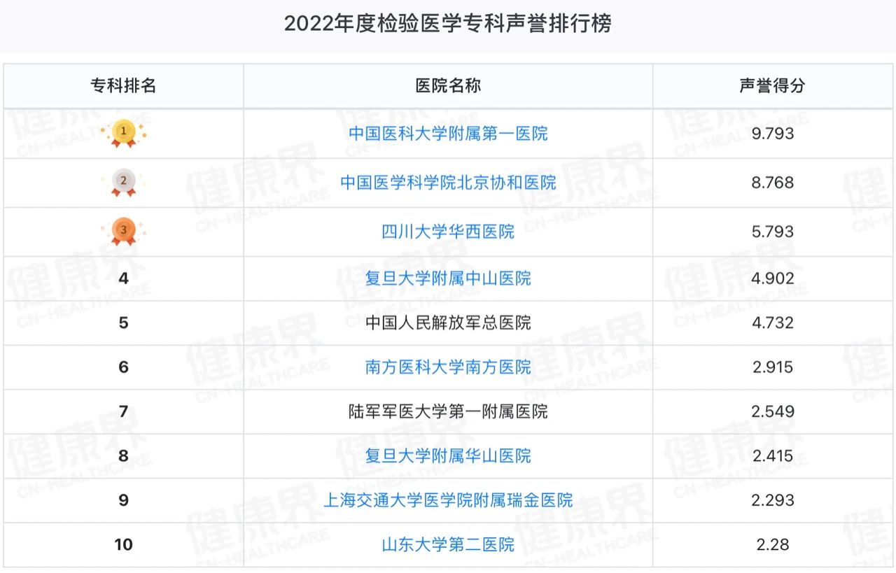 刚刚!2022年度中国医院排行榜全榜单在上海发布。今年的榜单包括年度全国综合排行榜、年度进步最快排行榜、年度专科综合排行榜、年度专科声誉排行榜。 中国医院及专科声誉排行榜是旨在助力学科建设的公益性项目,由独立的第三方医院管理学术机构开展,于每年11月公布上一年度结果,覆盖超过40个临床专科。榜单分为《中国医院专科声誉排行榜》、《中国医院专科综合排行榜》和《中国医院排行榜》。来自中华医学会、中国医师协会的超过5000名专家参与评审投票,其结果再结合医院科研投入与产出形成最终榜单。2022年度 检验医学专科综合排行榜