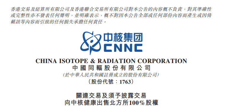 11月23日,中国同辐股份有限公司(01763)发布公告,有关公司拟通过北交所挂牌转让向中核健康出售其持有的北方所(北京北方生物技术研究所有限公司)的100%股权的相关事宜。