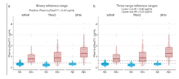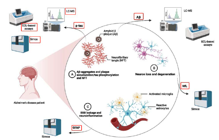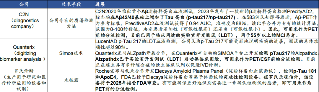 中国有983万AD患者,3877万MCI患者,就诊率极低 阿尔茨海默病(Alzheimer‘s disease,AD)是一种起病隐袭、呈进行性发展的神经退行性疾病,临床特征主要为认知障碍、精神行为异常和社会生活功能减退。中国年龄≥60岁老年人中,阿尔茨海默病患病率为3.9%,相当于有983万患有阿尔茨海默病。 图 | 中国70-79岁老年人的痴呆症患者数量最多(百万) 数据来源:《阿尔兹海默症患者临床就诊情况分析》,《2019年中国阿尔茨海默病患者家庭生存状况调研报告》,华福证券研究所 轻度认知障碍(Mild cognitive impairment,MCI),这是一个介于正常和失忆症之间的过渡状态。中国≥60岁老年人中,MCI整体患病率约为15.5%,有3877万MCI患者。 图 | 中国60-69岁老年人的轻度认知障碍患者数量最多(百万) 数据来源:The Lancet Public Health,华福证券研究所 AD患者就诊率极低,71.4%AD患者从未因痴呆症就诊过,97.2% MCI患者没有接受诊疗。接受就诊的患者中,约80%为中重度AD患者。只有14.4%AD患者服用胆碱酯酶抑制剂、美金刚等药物。超过一半的患者因为治疗效果不佳而停药,90%的患者表示愿意尝试新药。 AD治疗原则:尽早治疗,及时治疗,终身管理。1/3的MCI患者会在35年内进展为痴呆症,为治疗提供了时间窗口。如果病人能够接受早期诊断并采取早期的药物治疗,能够在一定程度延缓病情发展。 图 | 就诊时AD患者疾病严重程度及用药情况 数据来源:The Lancet Public Health,华福证券研究所 CSF和PET是目前早期AD诊断金标准,Tau-PET可预测认知能力下降速度 根据《阿尔兹海默症源性轻度认知障碍诊疗中国专家共识2021》,AD源性MCI的诊断与鉴别诊断主要包括神经心理评估、体液检查和影像学检查来联合诊断。Aβ-PET和Aβ脑脊液(CSF)检查两者结果存在很强的一致性,是目前早期AD明确诊断的主要方式。在整个AD疾病进展过程中,CSF Aβ/P-tau 217/以及AβPET在无症状个体中(MCI之前的阶段)可以被检测出增加,Tau-PET开始增加的时间相对较晚,伴随着脑萎缩和认知症状的出现(MCI),并随着疾病的进展而继续增加,Tau PET也被认为是预测认知能力下降速度的最佳方法。 表 | 阿尔兹海默的PET和CSF检查生物标志物及其优缺点 数据来源:《中国阿尔兹海默症报告2021》,头豹研究院,华福证券研究所 PET和CSF检查均有患者接受程度较低的缺点。CSF需要住院做穿刺,检查前需要评估患者凝血功能,腰椎穿刺步骤复杂,有感染风险,造成患者依从性较差。PET侵入性低,但PET单次约1万元,成本方面没有优势,且PET也有一定的辐射风险。 图表 | 从认知正常到轻度认知障碍最后痴呆的过程中生物标志物的变化 数据来源:The Lancet Neurology,华福证券研究所 质谱检测、Simoa技术和基于化学发光的检测方法是主要技术路线 在2023年的阿尔茨海默病协会国际会议(AAIC)上,NIA-AA公布了阿尔茨海默病最新诊断标准指南,明确将蛋白血浆生物标志物纳入生物标志物分类、疾病诊断和分期更新标准。目前研究表明,血液测试能够与新的AD疗法协同,有望成为测量Aβ蛋白的金标准。考虑到血液测试的成本和可及性较高,未来有可能替代CSF和PET检查。 图 | 血液检查的主要分析平台以及有前景的生物标志物 数据来源:Journal ofAlzheimer’s Disease Reports 7 (2023) 355–380,华福证券研究所 目前已开发和临床验证多种血浆生物标志物,包括血浆Aβ42/Aβ40、p-tau181、p-tau217、p-tau231、NfL和GFAP。但人体有血脑屏障,标志物从脑里渗透到血液的蛋白指标本身浓度极低,对检测方法的灵敏度要求极高。各生物技术公司试图从各个角度入手改进现有的蛋白检测技术,以突破超低丰度蛋白质检测的瓶颈问题。普遍分为3个技术流派:质谱仪检测(LC--MS)、超敏感的ELISA单分子免疫阵列技术(Simoa技术)以及基于化学发光的检测方法(ECL-based assays)。Simoa是一种超敏感的ELISA,使用抗体涂层珠与荧光共轭检测抗体和数字读数,而Simoa技术灵敏度比ELISA提高出1000倍以上,检测下限达到fg/mL,实现了超低丰度蛋白的有效检测和定量。 图 | Simoa使用荧光偶联的检测抗体和微孔来检测蛋白 数据来源:Raybiotech官网,华福证券研究所 血液检测可作为PET/CSF前的分流检测,约20%的患者可能需进一步诊断 CZN证明了其质谱方法检测Aβ40灵敏度10 -1780 pg/mL;,Aβ42为2 -254 pg/mL,低于在患者样本中观察到的浓度(在数千个临床样本中,Aβ40和Aβ42测量的最低浓度分别为163 pg/mL和12 pg/mL)。一项发表在神经领域核心期刊《Brain》的研究纳入10个公司的血浆p-Tau的性能比较,从检测方法来看,质谱检测的数据与脑脊液检测结果的相关性较好,其次为Simoa法;从标志物来看,P-tau217更有前景。 图 | Aβ阳性的二分和三分ALZpath pTau217参考范围 数据来源:medRxiv. 2023 Jul 12:2023.07.11.23292493.,华福证券研究所 备注:MRI,Aβ-PET和tau-PET数据可用于TRIAD和WRAP;脑脊液生物标志物包含在TRIAD和SPIN的一个子集。 ALZpath公司开发的基于Simoa技术的血浆ALZpath pTau217是目前图表:十个公司血浆P-tau的检测用于诊断早期AD的性能比较唯一可用于血浆P-tau 217商业测试的产品,与已建立的CSF和PET生物标志物相比,血浆ALZpath pTau217对Aβ和tau病变的诊断准确性相似或更高。对参考点创建了一个“中间”区域(pTau217水平在0.4-0.63 pg/mL之间),大约20%的个体落入“中间区域”,需要通过CSF或PET进行确认性检查。即这个方法可以用来作为PET/CSF前的分流检测,筛除Aβ阴性极低风险的的患者。 图 | 十个公司血浆P-tau的检测用于诊断早期AD