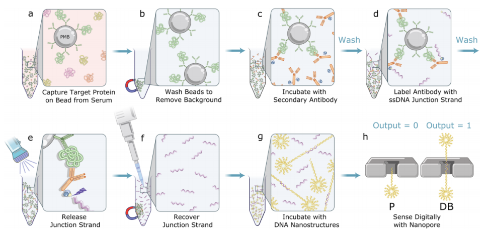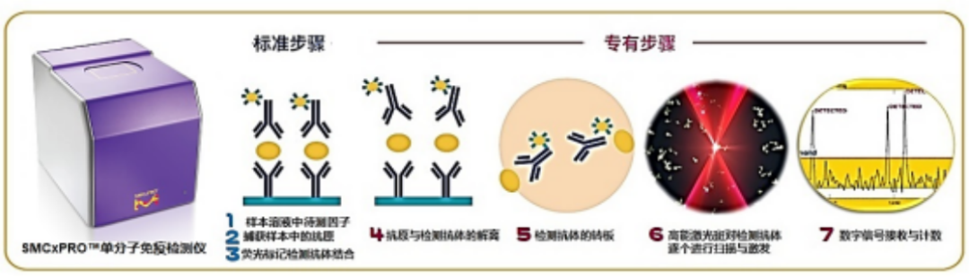 随着阿尔茨海默症(AD)药物获批单分子免疫检测Quanterix公司股价大涨。随之而来的阿尔茨海默症相关检测、治疗、护理、心理疏导等多方面产业均有利好。其中检测领域爆出260亿元市场规模,各大厂家争相入场。 AD症的检测历来以认知测试、影像、脑脊液指标为主。主要原因是脑中Aβ聚集在血脑屏障内发生,大多数标志物无法大量穿过血脑屏障在外周血中被检测到。比如p-tau蛋白血液含量含量仅为1pg/mL左右,分型的磷酸化Tau蛋白如P-tau181、P-tau217等可能cutoff在0.5pg/mL,化学发光等传统手段无法稳定检出。这时单分子免疫检测扛起大旗。 随着7月,NIA-AA修订的阿尔茨海默病临床标准,强调血清标志物用于AD症检测。AD检测低丰度标志物将单分子免疫检测技术带入主流IVD的舞台。也是目前看来潜力最大的单分子免疫检测应用场景。 科研层面以Quanterix公司的SiMoA(single molecule array)单分子技术能否站稳IVD和生命科学,后续系列文章专题讨论。 PubMed关键词SiMoA检索文章数量超过600篇(截至20230731) 什么是单分子检测 我用自己的理解转化成大白话,一堆1元硬币里面找一个5角的硬币,简单的办法是铺平,使5角硬币暴露出来。 同样一堆分子里面找一个待检测物,把分子铺成单层,也容易找到。 常用的方法有: 多孔芯片,每个孔落一个分子。 扁片芯片,液体流过自发成单层。 薄反应杯,液体落进去成竖向单层。 也有报道利用纳米孔检测蛋白分子,液滴类的dPCR用的比较多,但还未见商品化。 单分子免疫检测技术及厂家简介【更新】 单分子免疫很多大咖官博、老纪写过技术原理,又自己学习了一遍 单分子免疫部分列表 1、Quanterix公司的SiMoA(single molecule array) 分子免疫阵列(single molecule array,SimoA)技术,是一种将单分子计数用于蛋白质生物标记物的检测方法。该技术检测限可达飞摩尔(fg/mL)数量级,是目前最具代表性的单分子免疫检测技术。 系统源自于DavidWalt与David Duffy的团队开发的一套“DigitalELISA”检测系统。其检测原理与数字PCR近似,都是通过微反应器单元进行单分子隔离结合单分子水平信号放大来实现的。 美国Quanterix公司的创始人是David Walt,他是美国塔夫茨大学化学系的教授,不仅是美国国家科学院和工程院的双料院士,还是基因测序龙头企业Illumina公司的创始人。 Quanterix公司诞生于2007年,由顶尖科学家Illumina创始人之一David Walt博士及其团队创立。公司成立后,自带光环的Quanterix公司陆续获得Bain Capital、生物梅里埃、ARCH Venture等顶级机构或产业公司投资。 2010年,David Walt与David Duffy于Nature Biotechnology发表SiMoA技术相关论文,首次提出Digital Elisa的技术概念。 2012年,Quanterix公司将医疗诊断业务独家授权给生物梅里埃,联合开发诊断产品。 2013年,在经历了5年艰难的研发周期后,Quanterix公司正式推出其全自动单分子免疫检测平台——HD-1系统。 2014年5月,传奇经理人Kevin Hrusovsky辞去PerkinElmer高级副总裁兼生命科学与技术部门总裁的职务加入Quanterix公司成为公司董事会执行主席,并于2015年成为公司总经理。Kevin Hrusovsky加入Quanterix后为公司梳理了更为合适的发展规划,制定了后来的上市计划及Quanterix在神经科学领域的重要战略布局。 2017年,Quanterix在纳斯达克上市,概念销售收入达到2287万美元。 2018年,公司实现销售收入3763万美元,实现了近65%的收入增长,其中有过半收入来自于药厂。该年Quanterix公司为了确保其在医疗诊断市场的自主权利,从生物梅里埃回购了SiMoA技术在医疗诊断领域的业务权利,为其后续神经科学(特别是阿尔茨海默症相关)诊断领域的市场布局做好准备。 2019年,Quanterix推出与美国Meso Scale Discovery多指标电化学发光系统对标的SP-X系统以进一步推进其在药物研发领域的市场份额,全年预计可实现营收5500万美元。 至2019年末,Quanterix公司已实现全球近400台的设备装机量,平均每台设备的试剂消耗量预计可以超过6万美元,作为科研领域的免疫检测设备,考虑到其高昂的销售价格,已经能算是战绩显赫。 Quanterix的产品线 HD-1与HD-X性能比较 SiMoA技术是基于微阵列芯片的单分子免疫检测,是在毫米级芯片上雕刻(或浇筑)成千上万个微米级微井,每个微井体积约 40 fl 左右,随后将免疫复合物磁珠分配于微井中,再借助高分辨率荧光显微镜对荧光点进行计数,依据泊松分布理论,计算同时含珠子与荧光产物孔的数量/含珠子孔总数的比值,以此确定测试样品中的蛋白质浓度。 SimoA 原理图 SiMoA通过磁珠酶联免疫反应与微孔阵列芯片的结合,实现单分子蛋白检测。其操作流程如上图 (1)利用表面标记有捕获抗体的磁珠捕获样品中的抗原; (2)使用biotin标记的检测抗体对被捕获的抗原进行标记; (3)加入链霉亲和素—半乳糖苷酶复合物,与检测抗体上的biotin结合; (4)将反应洗净后的磁珠与底物混合,加载到含有微孔阵列的检测芯片中,利用磁场使磁珠落入与其尺寸完全匹配的微孔中(3μm左右),加入油相,使得微孔之间物理隔离; (5)含有半乳糖苷酶的微孔由于酶分子催化底物产生荧光产物; (6)对微孔阵列进行荧光成像,通过对发出荧光信号的微孔个数对照标准曲线来实现定量检测。 SiMoA系统存在很明显的一些缺点: (1)检测操作流程过于繁琐复杂。 (2)SiMoA系统使用的盘式微流控芯片加工精度高,生产成本高昂。 (3)SiMoA检测系统单次检测耗时长达1小时以上,远超过目前免疫诊断市场中已经能轻易实现的15分