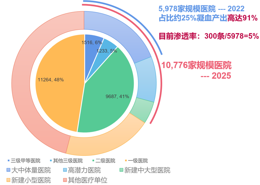 上文我们为您揭秘了中德技术结晶Pangolin LAS全自动凝血流水线打破竞争壁垒的底层逻辑,本节将为大家展示Pangolin LAS作为凝血江湖的屠龙宝刀斩金断玉的独特属性,解密其让人趋之若鹜的终极法门。 IVD血栓与止血赛道的内卷和破卷 众所周知,IVD主要由生化、免疫、分子、POCT、血栓与止血、微生物诊断等细分领域构成。其中,说到凝血功能检测,想必大家更不陌生,这既是几乎所有心脑血管疾病及危急重症的常规检测,也是所有有创手术必查项目,检测结果对于指导临床诊疗起着决定性作用,稍有疏忽,就有可能酿成危及生命的大错。特别是在全球老龄化加剧和大众对精准诊疗的关注提升的现今,作为可导至脑卒中、冠心病、心肌梗死、房颤、静脉血栓栓塞症等几乎所有的心脑血管疾病的重要影响主因“榜首”,血栓一直以来被广泛认为是心脑血管疾病的“元凶”。而通过血栓与止血的体外诊断,则可以直接有效的帮助医生分析血栓和出血形成的原因,对包括心脑血管疾病在内的血栓性疾病以及出血性疾病等进行预防、筛查、诊断和监测,可以用于评估血栓风险,指导对心脑血管疾病的预防的整个过程。特别对于人口基数大的我国,随着老龄化程度的加剧,血栓性疾病患者逐年增加,未来随着学术和技术的发展,血栓与止血诊断在中国市场上还有极大的发展空间。 根据市场公开数据显示,血栓与止血诊断市场目前仍然处于高速发展期,2018年市场规模约55亿元,预计2023年我国血栓与止血诊断的市场规模将达到118亿元,五年复合增长率高达31%。据广州标点统计,凝血检测占国内血栓与止血体外诊断市场份额的比例超过95%,而Werfen(沃芬)、Sysmex(日本希森美康)以及Stago(法国思塔高)等主要国外厂家占有80%以上的国内市场份额,并覆盖国内大多数三级医院;以赛科希德、塞力斯生物、迈瑞医疗、上海太阳为代表的国内企业占有的市场份额较少,但市场份额逐年提升,其中该4家占2018年国内血栓与止血体外诊断市场份额的比例分别为4%、2%、3%及5%。从数据和市场占有率来看,受限于技术壁垒的影响,凝血是个难啃的“硬骨头”,和血气一样,都是外企占据了绝对优势,对于国产产品无论是产品研发难度和客户认可度都挑战不小,未来要么是自下而上的市场策略或者硬碰硬的国产替代,都有巨大的发展空间。 突破IVD内卷,占领破卷的最后一块“高地”,进口和国产品牌都跃跃欲试。 9月21日 九强公告,罗氏诊断向九强生物采购适用于罗氏诊断全自动凝血分析仪的试剂盒,以补充罗氏诊断的凝血检测菜单。 9月9日 贝克曼与艾科达举行签约仪式,正式宣布在凝血领域开展战略合作。贝克曼库尔特独家代理艾科达高端凝血产品。 7月25日 安图生物与希肯医疗宣布在凝血检测领域开展全方位的深度合作,为医学实验室领域提供完善的凝血检测产品与服务解决方案。 去年8月 专注于凝血领域的赛科希德上市;万孚生物上市POCT凝血分析仪、发布血栓弹力图仪等;基蛋生物投资景川诊断进入凝血赛道。 据CACLP的统计,目前国产凝血检测相关厂家超过了40家。 通过和生免细分赛道的对比,并反观产品生命周期迭代周期,从最初的手工检测1.0时代,到单机自动化2.0时代,再到随着更多头部厂家的“下场”、资本的关注,升级到集群自动化3.0时代。血栓与止血诊断市场中,相比单机自动化设备厂家超40家的数量,我们注意到拥有凝血全自动流水线的厂家,放眼全球至今仍仅不到10家,其中进口品牌包括沃芬、希森美康、思塔高、积水、罗氏;国产品牌艾科达、九强、迈瑞,以及拥有中德双重“基因”的BE-塞力斯生物。而在这不到10家的范围内,已经成熟应用并具备一定流水线标杆客户的只有沃芬、希森美康、思塔高、积水以及BE-塞力斯生物。 根据2022年国家卫健委统计资料显示,目前全国医疗机构共计2.37万,其中三级医院2749个(其中:三级甲等医院1516个),二级医院9687个,一级医院11264个。至2025年,市场容量以年均增长11%预计,全国医疗机构总数将达到3.15万家。而数据显示,在这其中,占比约 25% 但止凝血试剂产出高达 91% 的 5978 家规模医院中,凝血全自动流水线全国装机量仅不到 300 条,市场渗透率仅为 5% 。 随着国内人口老龄化的加剧,患心脑血管疾病和慢性病的人群逐年增加,凝血诊断的需求也在快速增长,尤其高通量三甲医院检验科的进口替代机会,原本渗透率不足的临床科室/ICU市场、基层医疗,均释放出强大的信号:百亿凝血检测自动化广阔市场,大有可为! 图1:2022年国家卫健委统计全国医疗机构数量 把握大趋势、下好“先手棋”,塞力斯生物与德国BE前瞻布局,并在2022年正式推出作为“中德技术结晶”的Pangolin LAS全自动凝血流水线,除搭载的检测模块XRS与罗氏在国外上市的t611同源外,流水线线体同样与罗氏同源,其研发智造均在中国的智能工厂完成下线。《震惊丨国内IVD凝血厂家竟然和罗氏完全同源!》。针对凝血标本周转时间长、标本峰值集中、检测结果要求高、试剂成本需可控等行业痛点,全方位匹配医院实验室对检测品质、可靠性、运行效率以及试剂丰富性、使用经济性的需求。一经面世,便在凝血江湖掀起高通量智能流水线新风潮。 ▸ 一站式进出样模块,加载卸载样本一处即可完成。 ▸ 并行4轨道及循环式样本传输系统,高通量高效率。 ▸ 高容量缓冲系统,避免轨道、检测模块拥堵,冗余防护。 