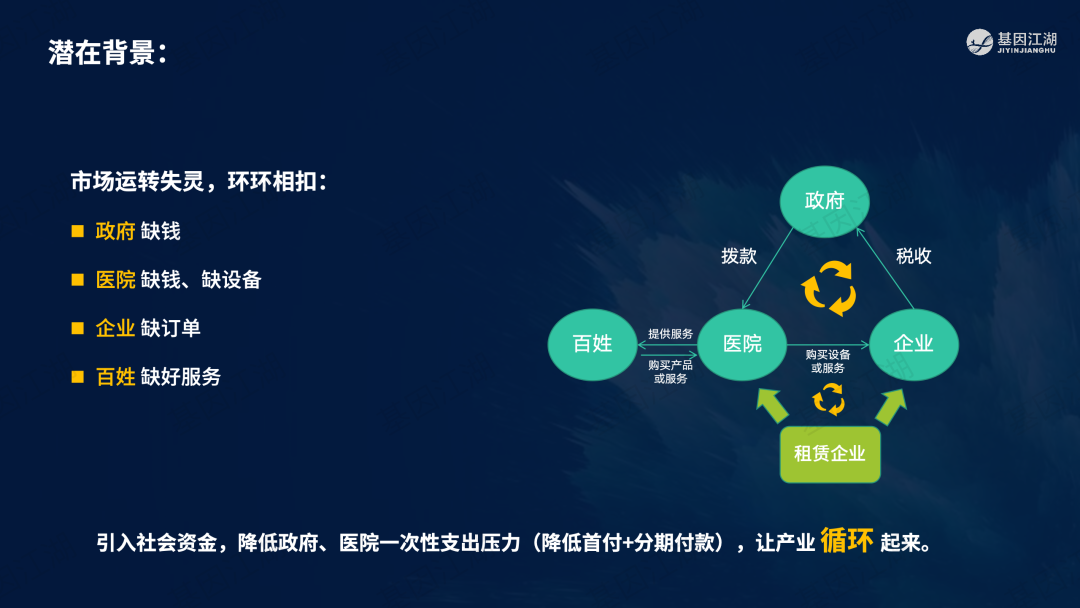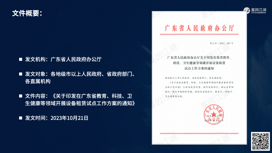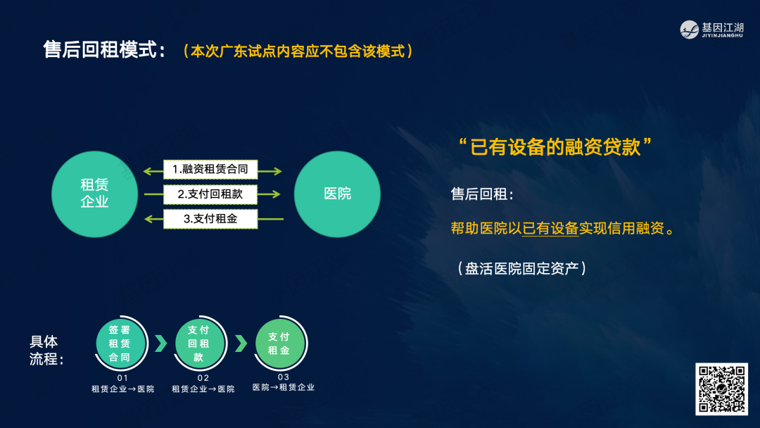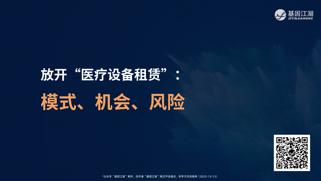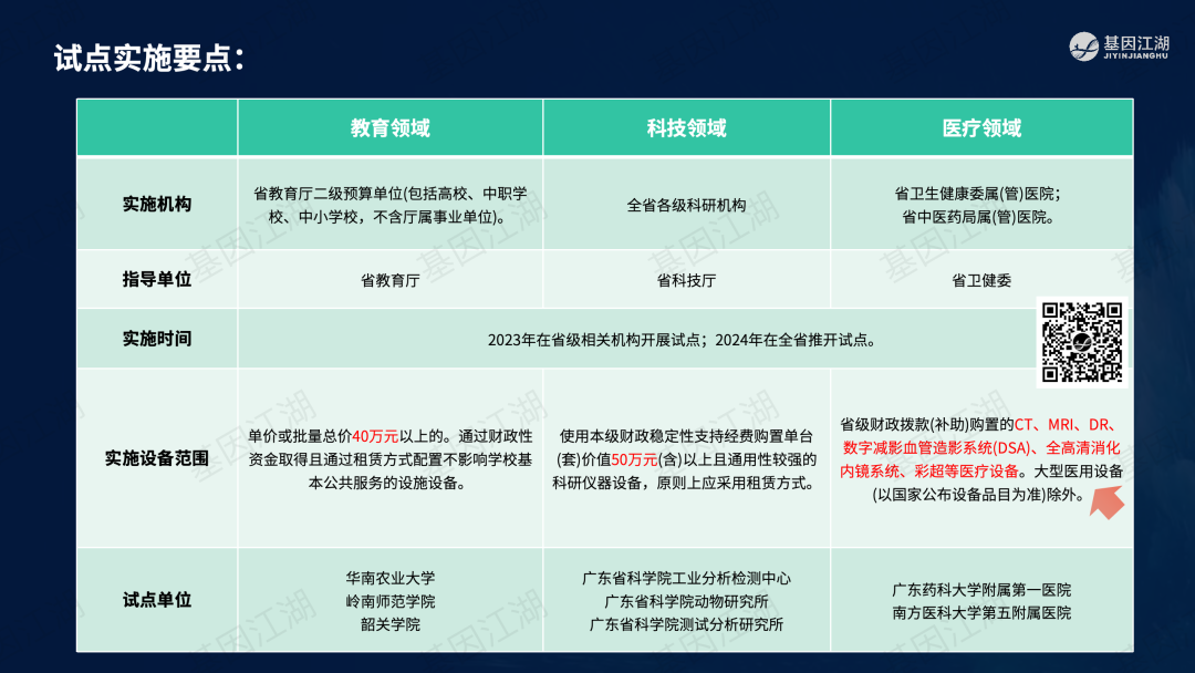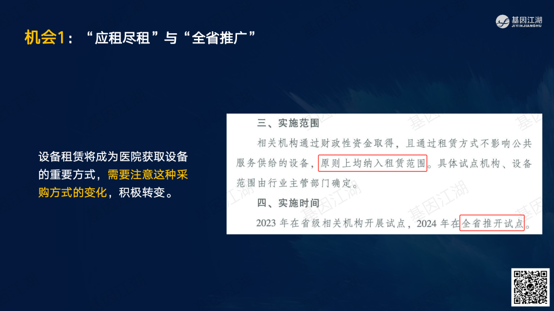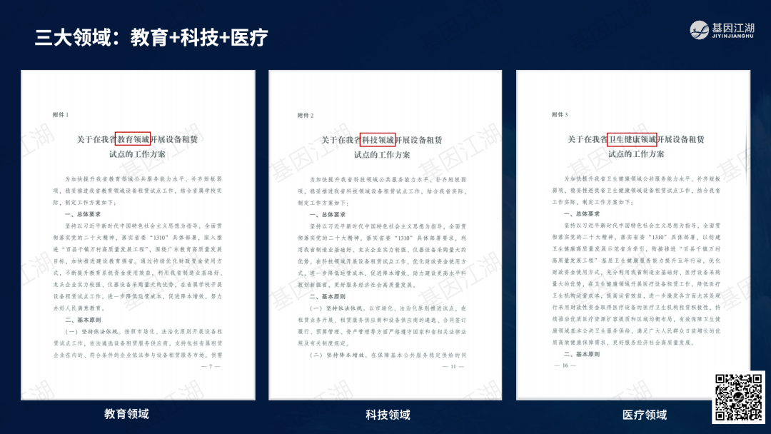 设备融资租赁并非新鲜事,但一直未成为市场主流模式。之前政策明令禁止医疗机构举债大规模扩建、购置大型医疗设备。此次广州“设备租赁”试点文件,有“应租尽租”倾向,并在2024年全省推广,政策支持信号明显。文件实施的潜在背景为,当前各级政府财政压力巨大,医院在各种政策的约束下收入下降、负债高企,企业订单缺乏,整个市场缺乏活力;此次文件,借政策力量撬动社会资本,平滑财政支出压力,同时促进产业循环,利好行业。 本次试点包含“教育”、“科技”、“医疗”三大领域,本篇重点关注医疗领域。但对于基因测序厂家而言,“教育-高校、科技-科研院所、医疗-医院”均为潜在客户。这些“有实力的租赁企业”是否会成为未来竞争的关键要素?政策有“严禁借租赁之名,捆绑设备耗材销售”条款;实际操作中,也有“名为租赁、实为投放”之举;这些“不正当竞争”的风险,需要规避;除此以外,医院的能级和患者数量决定了医院的偿债能力,注意债务风险。