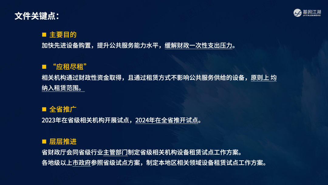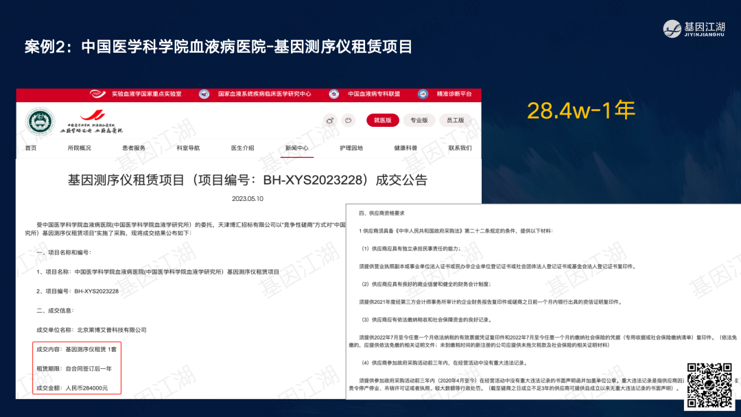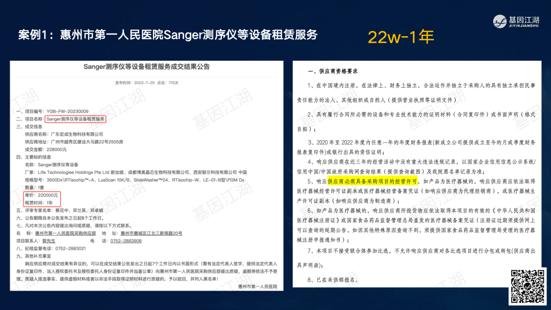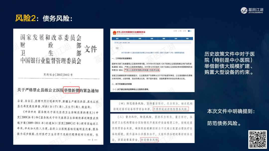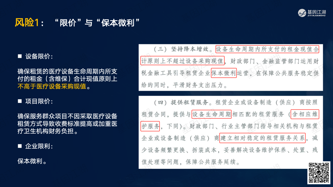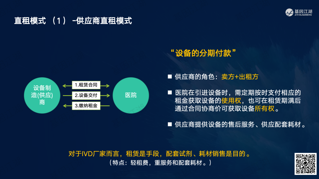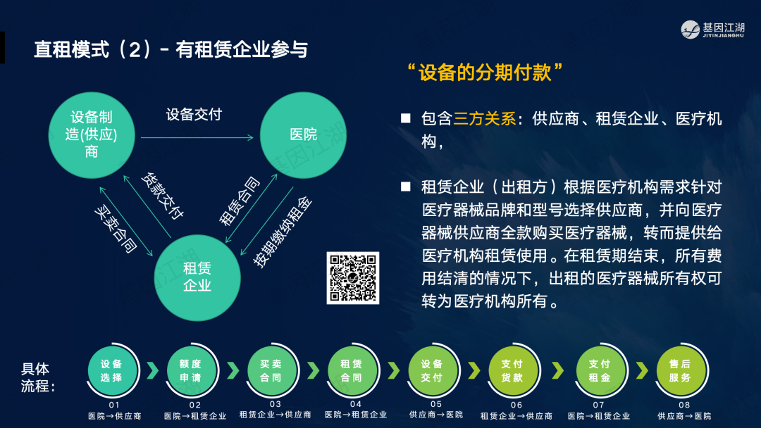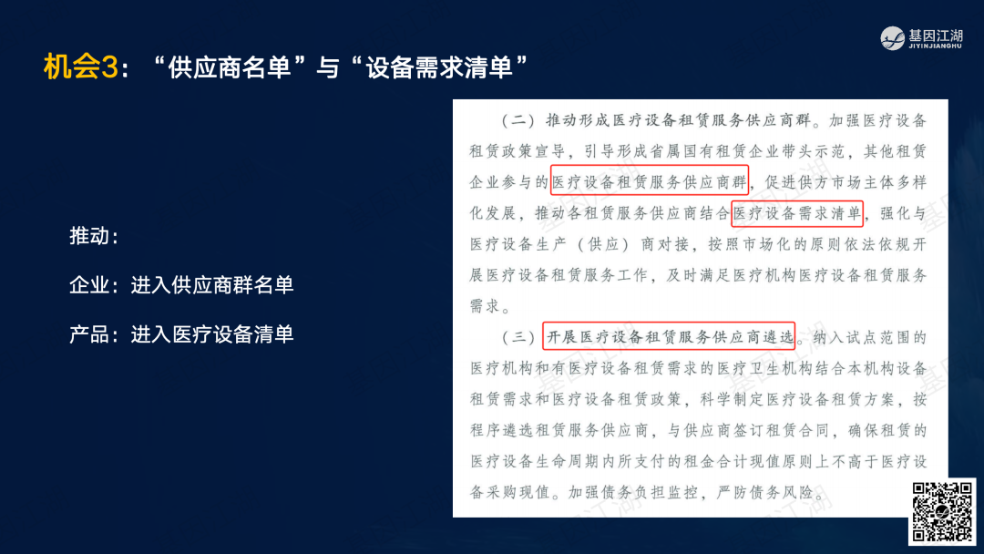 设备融资租赁并非新鲜事,但一直未成为市场主流模式。之前政策明令禁止医疗机构举债大规模扩建、购置大型医疗设备。此次广州“设备租赁”试点文件,有“应租尽租”倾向,并在2024年全省推广,政策支持信号明显。文件实施的潜在背景为,当前各级政府财政压力巨大,医院在各种政策的约束下收入下降、负债高企,企业订单缺乏,整个市场缺乏活力;此次文件,借政策力量撬动社会资本,平滑财政支出压力,同时促进产业循环,利好行业。 本次试点包含“教育”、“科技”、“医疗”三大领域,本篇重点关注医疗领域。但对于基因测序厂家而言,“教育-高校、科技-科研院所、医疗-医院”均为潜在客户。这些“有实力的租赁企业”是否会成为未来竞争的关键要素?政策有“严禁借租赁之名,捆绑设备耗材销售”条款;实际操作中,也有“名为租赁、实为投放”之举;这些“不正当竞争”的风险,需要规避;除此以外,医院的能级和患者数量决定了医院的偿债能力,注意债务风险。