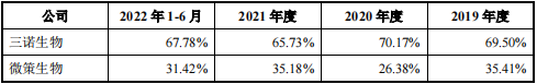 根据招股书显示,微策生物成立于2013年,专业从事POCT产品的研发、生产与销售。自然地,将与新冠抗原检测发生关联。报告期内(2019-2022年H1)的营业收入分别为1.69亿元、6.72亿元、12.63亿元及4.91亿元,而新冠检测产品收入分别占到的比例为:0%、69.74%、77.11%及 74.52%。受益新冠检测产品,明显改变收入结构。