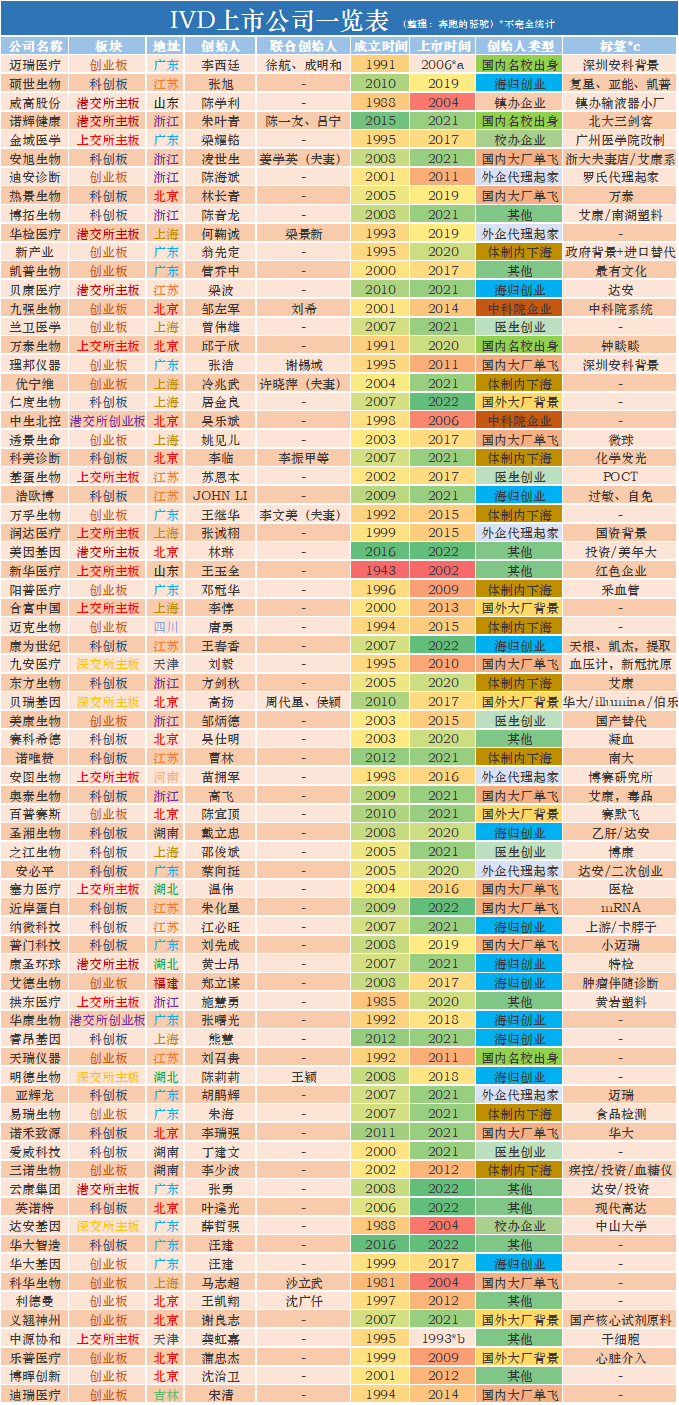 从下面这张不完全且有可能不恰当的统计表说起,这个一览表汇集了在创业板、科创板和主板上市的相关IVD企业的信息,包括其地址、成立时间、上市时间、创始人的类型和标签等。