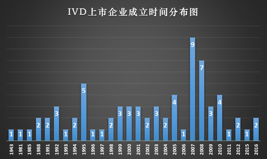 首先是成立时间,整体来看成立时间相对比较分散,1998-2005年是第一个相对集中的时间区域,平均每年有3家上市公司成立;2007-2008两年算是IVD上市公司的成立大年,平均每年有8家上市公司成立。