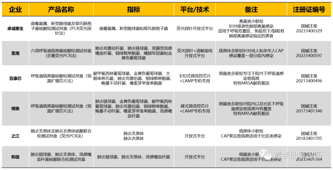根据(2016年版)中国成人社区获得性肺炎诊断和治疗指南,在我国成人CAP中,肺炎支原体(MP)和肺炎链球菌(SP)是重要的致病原,其他致病原还包括流感嗜血杆菌(HI)、肺炎衣原体(CP)、肺炎克雷伯菌(KP)、金黄色葡萄球菌(SA)。病毒在成人CAP中仅占到15%-34.9%,而在其中流感病毒占致病病毒首位。根据《中国老年社区获得性肺炎急诊诊疗专家共识2023》报道,老年人CAP主要致病原主要为以革兰氏阴性菌为主。其致病原和院内感染很接近,以肺炎克雷伯菌,大肠埃希氏菌(ECO),铜绿假单胞菌(PA),肺炎链球菌为主而以真菌和一些不典型致病菌为辅。而儿童CAP则是以病毒感染为主,根据《儿童社区获得性肺炎诊疗规范(2019年版)》报道,目前呼吸道病毒是婴幼儿乃至学龄前期 CAP的常见致病原。常见的呼吸道病毒包括呼吸道合胞病毒、流感病毒、腺病毒、副流感病毒等。而常见细菌多为肺炎链球菌,金黄色葡萄球菌,流感嗜血杆菌,卡他莫拉菌还包括肺炎衣原体和肺炎支原体等。针对目前成人的HPV/VAP主要致病原而言,根据中国成人医院获得性肺炎与呼吸机相关性肺炎诊断和治疗指南(2018版),具体致病原如下图:相较于成人CAP而言成人HAP/VAP的主要致病原为鲍曼不动杆菌(AB)、铜绿假单胞菌(PA),除此以外还包括,肺炎克雷伯、大肠埃希氏菌、金黄色葡萄球菌、阴沟肠杆菌(EC)、嗜麦芽窄食单胞菌(SMA)等。因此可以看到目前我国对CAP和HAP/VAP来说,最重要致病原是不同的例如CAP是SP、MP而HAP/VAP为AB、PA,其也有很多致病原是共同的例如SA、ECO、KP等。但也有不同的致病原例如CAP的HI、CP或者是HAP/VAP的SAM和EC等。从上图中可以清楚的看到各类检测方法的优缺点,目前认为分子检测或者分子POCT综合看起来是更适合下呼吸道致病原的检测方法。对于非爆发性的CAP和HAP/VAP而言,需要诊断方法是既快又准的且需要覆盖较多的指标,但是通量相对要求不大。而且对于CAP来说其实更需要分子检测,因为CAP主要感染源是SP、HI这类苛养菌培养容易失败。而对于HAP/CAP而言其,检测指标中的SA根据Chinet细菌耐药网2023发布的上半年数据有约31.7%的MRSA耐药而对于KP、AB、PA来说碳青霉烯类的耐药率也很高(鲍曼对亚胺培南和美罗培南耐药率快到80%了)。具体可以翻翻大浩之前写的呼吸道多联检产品的现状这篇文章。所以针对住院患者而言不仅是致病原要查耐药基因也得测。目前已经获证的针对CAP或者HAP/VAP致病原的分子检测类产品如下:
