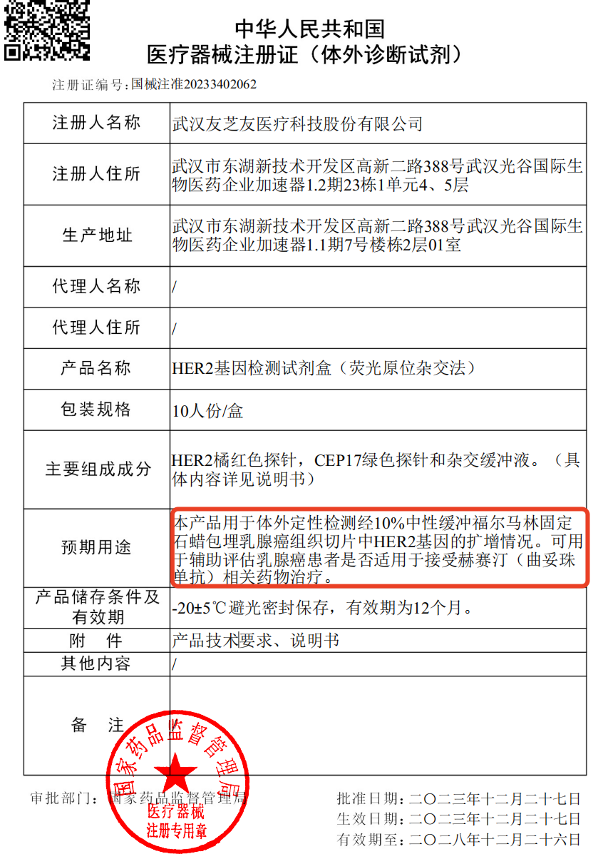 新品喜讯 RAPID FISH产品线喜获三类证新成员!武汉友芝友医疗科技股份有限公司自主研发生产的“HER2基因检测试剂盒(荧光原位杂交法)” 正式通过国家药品监督管理局(NMPA)审批,获得III类医疗器械注册证(国械注准20233402062)。 伴随诊断 精准检测乳腺癌HER2扩增状态 芝友医疗“HER2基因检测试剂盒(荧光原位杂交法)”基于荧光原位杂交原理,采用双荧光探针技术,在福尔马林固定、石蜡包埋的人乳腺癌组织样本中检测 HER2 基因的扩增。该试剂盒采用独特寡核苷酸探针平台制备杂交探针,其探针长度及分子量小更容易进入细胞核,且目标序列覆盖率大于99%,能够高质量的实现「2h」快速FISH杂交实验。 HER2检测的临床意义包括评估患者预后、指导靶向用药、合理选择辅助化疗方案等。精准的HER2检测结果能够更好地助力临床识别适合应用HER2靶向治疗的乳腺癌患者,进而最大化患者获益。芝友医疗“HER2基因检测试剂盒(荧光原位杂交法)”,可用于辅助评估乳腺癌患者是否适用于接受赫赛汀(曲妥珠单抗)相关药物治疗。 引擎驱动 RAPID FISH寡核苷酸探针技术 芝友医疗RAPID FISH平台是利用寡核苷酸探针技术(Oligo-FISH),借助生物信息学手段对基因组序列进行打断,建立数据库过滤设计,剔除了潜在的重复序列和非特异性序列,最终筛选设计出经过荧光标记的高特异性探针。该平台摆脱了传统BAC克隆的技术限制,不仅高质量的实现了「1- 2h」快速FISH杂交实验,同时支持小区间高分辨率特异探针的定制化服务。 热门产品HER2的快速获批表明,芝友医疗成功的将RAPID FISH快速杂交技术转化国家权威部门认可的成熟产品,促进了公司在分子病理诊断方向上更进一步。为持续助力精准医疗高速发展,芝友医疗FISH产品线从临床需求的角度出发,以“更快速”和“自动化”为关键词,提供临床实验所需的「前处理试剂盒+自动化设备+快杂探针组合」的整体解决方案,全产品线已获得近200项NMPA注册证和欧盟CE认证,产品性能优越、合规合法。 YZYMED 关于芝友医疗 武汉友芝友医疗科技股份有限公司(简称“芝友医疗”)成立于2011年7月,以心血管、肿瘤等重大疾病的个体化诊疗为战略方向,是一家专门从事个体化医学诊断产品研发、生产和销售的高新技术企业。公司秉承“量体裁衣、因人施治”的企业使命,力争成为个体化医学领域的龙头企业,打造实现自我价值和回馈社会的卓越平台。 公司建立了ARMS荧光定量PCR、多重荧光定量PCR、荧光原位杂交FISH、循环肿瘤细胞CTC检测、化学发光等多种技术平台,自主研发生产了指导心脑血管疾病个体化用药的分子诊断产品,指导肿瘤诊疗的伴随诊断产品,荧光原位杂交产品以及循环肿瘤细胞检测产品,为精准医疗提供临床诊断依据,持续助力精准医疗高速、高质量发展。 |