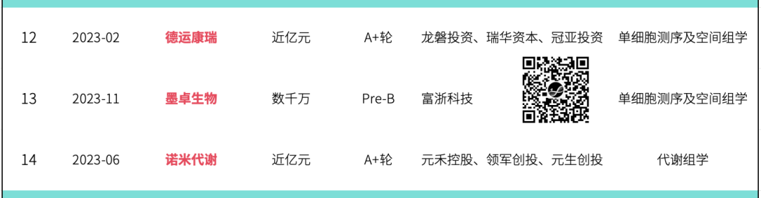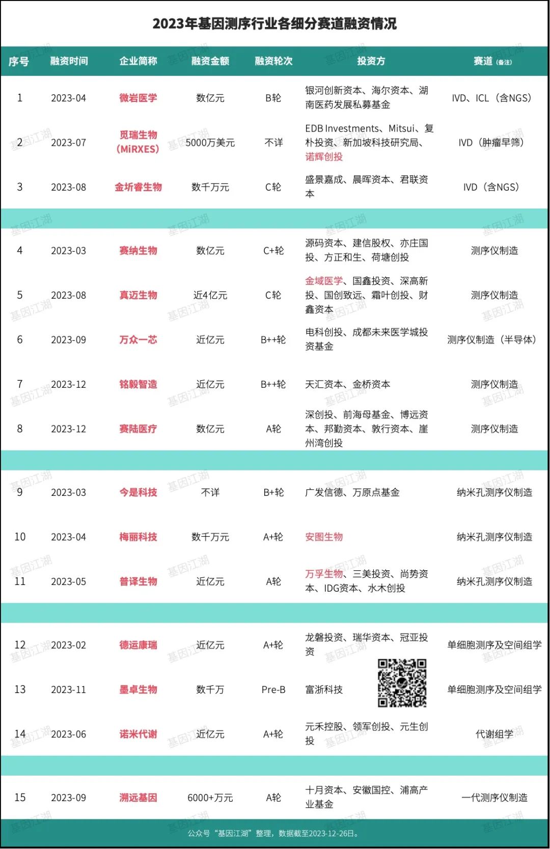 先看一张汇总图: 简单写写,欢迎拍砖,如遗漏,请留言补充。 2023年,基因测序行业的融资,有以下特点: (1)从产业链企业分布来看,2023年内融资主要集中在产业链上游,即测序仪上游制造端。 以NGS测序仪为主,如赛纳生物、真迈生物、铭毅智造、赛陆医疗; 纳米孔测序厂家:今是科技、梅丽科技、普译生物; 投资的逻辑,主要基于“硬科技”、“国产替代”、“测序应用的想象空间”; 华大智造在2022年顺利上市及业绩表现、齐碳科技在2022年末拿到的7亿元融资,对上游赛道的融资有所助力。 (2)国产单细胞测序赛道今年拿到两笔融资:德运康瑞、墨卓生物。 国产单细胞测序赛道,2022年是细分赛道融资高峰,今年融资数量腰斩。 赛道已进入商业化的关键年份,10余单细胞测序国产厂家同台竞技,市场竞争异常惨烈。 资本在观望:这个市场到底有多大?谁能跑出来? (3)产业链中游,2023年未见大额融资;年度内,仅有mNGS、tNGS感染领域的“微岩医学”拿到B轮融资; 未见遗传赛道、肿瘤赛道其他相关企业。 可能原因,产业发展不及预期致资本信心受挫、赛道企业前期估值过高; 后期融资关键要素:企业需证明自我造血及盈利能力、关键资质、关键应用市场的突破。 (4)从融资轮次来看,2023年内融资主要集中在中后期,早期及超早期融资较为困难。 可能原因:相同细分赛道已拥有一定数量玩家,后继者的机会(如技术趋同)需要谨慎评估。 (5)从融资用途来看,2023年年内融资,主要应用于新产品开发、产品注册、商业化拓展等,偏向企业商业化运营阶段;对早期概念阶段、纯研发阶段的投入较少。 (6)传统IVD、ICL龙头开始横纵向布局,如金域医学、安图生物、万孚生物、诺辉健康等;委身巨头不乏是创业企业路径之一( 详见:“巨头”围剿NGS企业:一些信号与拐点)。 (7)投资方多见国资背景。 整体来看,行业尚未出清,资本观望态度浓厚。 考验大家自我生存能力的时候又又又到了! |