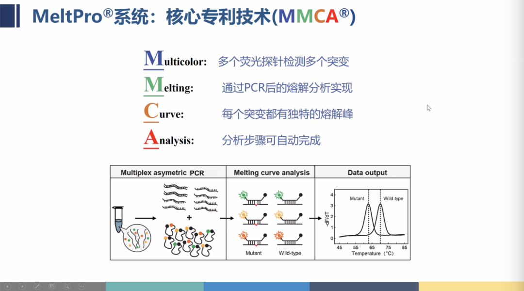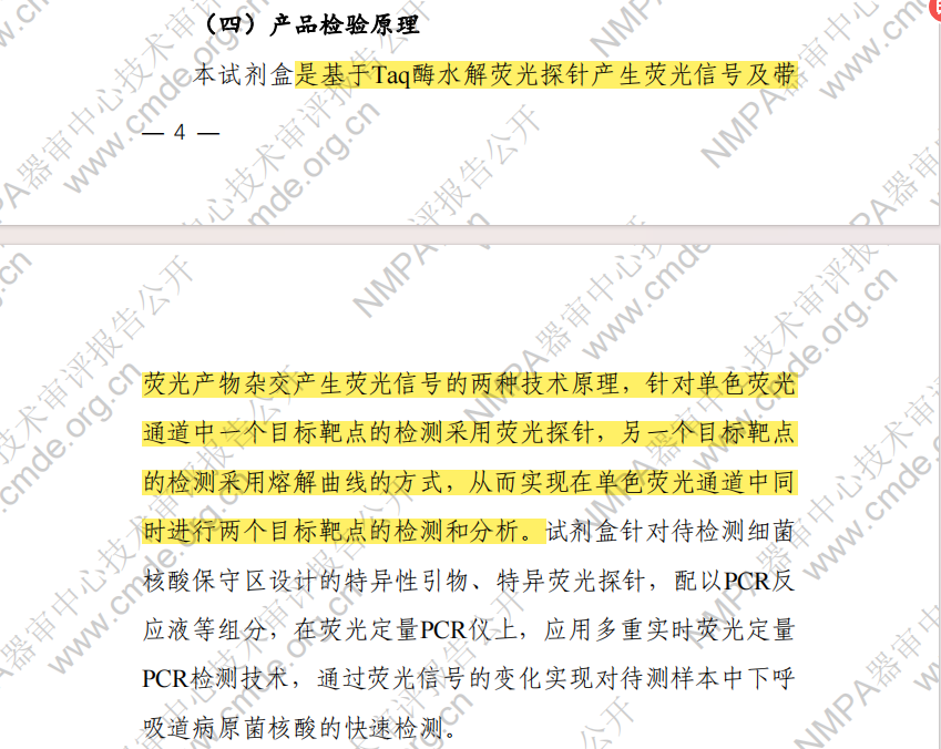 荧光检测仪的性能和设置会影响荧光信号的分辨和定量。荧光检测仪的性能要求具有高灵敏度和高分辨率,以区分不同的荧光信号和测量荧光信号的强度。荧光检测仪的设置要根据荧光探针或荧光染料的发射波长和荧光强度,选择合适的激发光源和滤光片,以提高荧光信号的信噪比和准确度。常用的荧光检测仪有 ABI 7500, ABI 7900, Bio-Rad CFX96, Roche LightCycler 480 等。 01 探针法 使用特殊的探针,如分子信标 (molecular beacon)、双重探针 (dual probe)、双重分子信标 (dual molecular beacon) 等,每种探针对应一个目标序列,通过探针的结构变化和荧光猝灭来区分不同的目标序列。一般取决于仪器,有多少通道就做到多少减一重,一个通道留给内标,现在市场上最常见的方法,探针编码那些难以实现产业化的前沿技术在此不做介绍。 荧光探针是一种与目标序列完全互补的寡核苷酸,通常在5'端和3'端分别标记有荧光发射体和荧光猝灭体。当荧光探针与目标序列杂交时,荧光发射体和荧光猝灭体之间的距离增大,荧光发射体发出荧光信号,而荧光猝灭体不再吸收荧光发射体的能量,从而实现对目标序列的检测和定量。探针法的优点是可以实现高灵敏度和高特异性的检测,避免非特异性扩增产物的干扰,但也需要设计合适的荧光探针和优化反应条件,以保证荧光探针的稳定性和效率。 数据查询源自NMPA 02 溶解曲线MeltArray 使用同一颜色的荧光探针,每种探针对应一个目标序列,通过探针的溶解温度和荧光强度变化来区分不同的目标序列。 溶解曲线是一种利用荧光染料来检测和定量特定的核酸或蛋白质的分子生物学技术。荧光染料是一种可以结合到DNA双链小沟中的染料,当荧光染料与DNA结合时,荧光强度增强,当荧光染料从DNA脱落时,荧光强度减弱。通过实时监测升温过程中DNA双链的解链和荧光染料的脱落,可以得到反映荧光信号变化的溶解曲线。不同的DNA序列由于长度和GC含量的不同,会有不同的溶解温度和溶解曲线,从而实现对DNA序列的检测和定量。溶解曲线的优点是可以实现高分辨率和高通量的检测,无需使用特异性荧光探针,但也需要选择合适的荧光染料和荧光检测仪,以保证荧光信号的信噪比和准确度 。 数据查询源自NMPA 图源自第二届结核病研发合作国际论坛,MeltPro系统技术运用不对称靶标扩增,融解分析,具备多重高通量的优势,具体多重原理采用不同的荧光,不同的熔点。 03 PCR-酶切法 使用同一颜色的荧光探针,每种探针对应一个目标序列,通过酶切后的片段长度和荧光强度变化来区分不同的目标序列。 PCR-酶切法是一种利用限制性内切酶来检测和定量特定的核酸或蛋白质的分子生物学技术。限制性内切酶是一种可以识别并切割特定的DNA序列的酶,当DNA序列中存在突变时,限制性内切酶的切割位点可能会改变或消失,从而影响限制性内切酶的切割效果。通过先进行PCR扩增,再进行限制性内切酶切割,可以得到不同的切割产物,通过凝胶电泳或荧光检测,可以实现对DNA序列的检测和定量。PCR-酶切法的优点是可以实现简单和快速的检测,无需使用荧光探针或荧光染料,但也需要选择合适的限制性内切酶和优化反应条件,以保证限制性内切酶的特异性和效率。 数据查询源自NMPA 图源自广州市宝创生物技术有限公司官网 04 探索