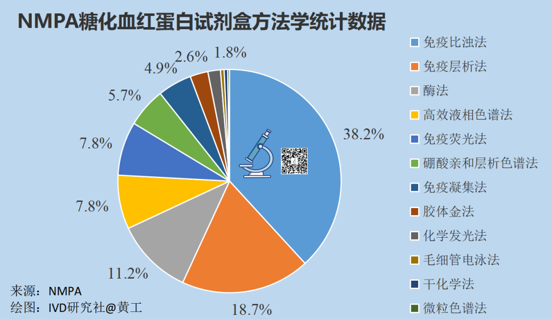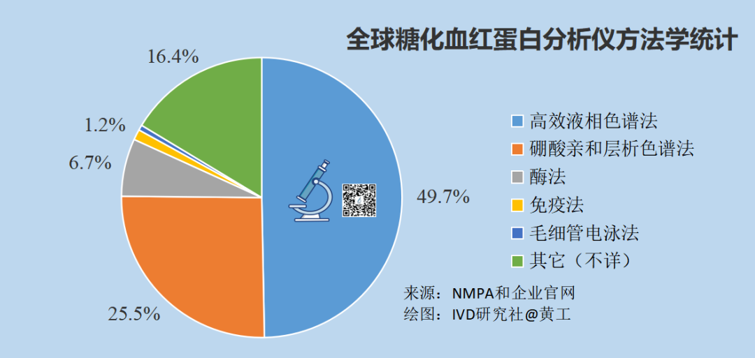 385个试剂盒中,采用免疫比浊法的147个,占38.2%;采用免疫层析法的72个,占18.7%;采用酶法的43个,占11.2%;采用高效液相色谱法的30个,占7.8%;采用免疫荧光法的30个,占7.8%,这包括时间分辨免疫荧光和量子点免疫荧光;采用硼酸亲和层析色谱法的22个,占5.7%;采用免疫凝集法的19个,占4.9%;采用胶体金法的10个,占2.6%;采用化学发光法的7个,占1.8%。据黄工统计,截至2023年12月31日,全球共有64家企业,有专用糖化血红蛋白分析仪(以自研为主),共计165个型号(同机型不同通量也单独统计)。采用高效液相色谱法的有82个型号,占49.7%;采用硼酸亲和层析色谱法的有42个型号,占25.5%;采用酶法的有11个型号,占6.7%;采用免疫法的有2个型号,占1.2%;采用毛细管电泳法的有1个型号,占0.6%;其它(不详)占16.4%。