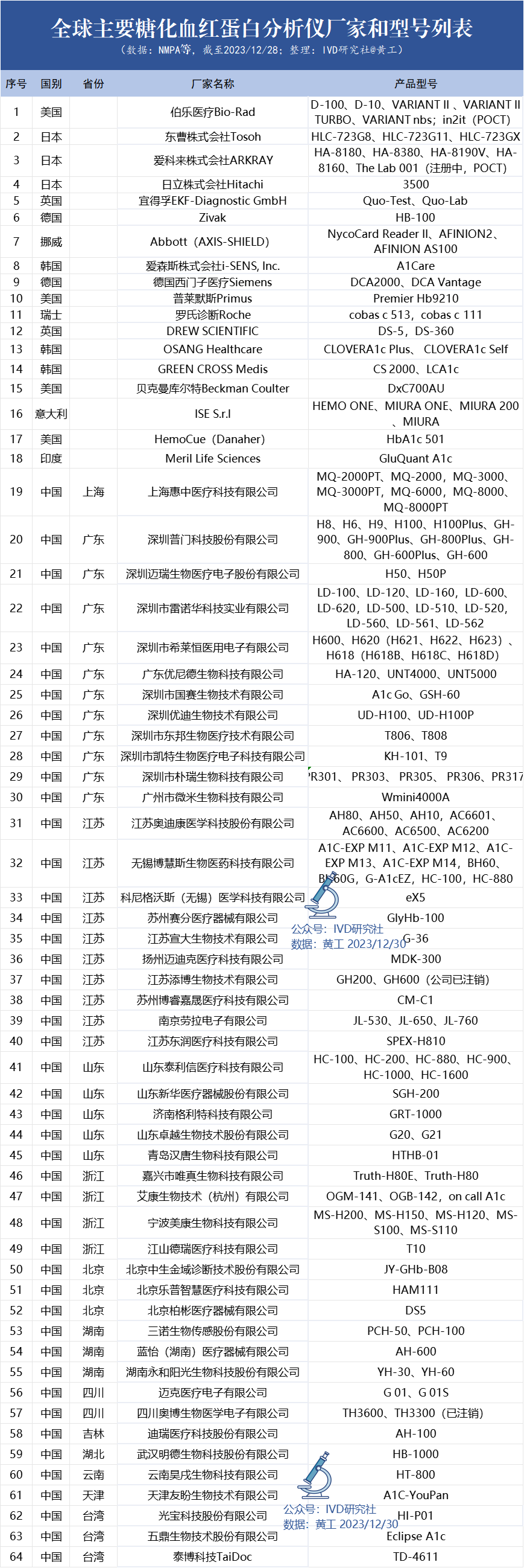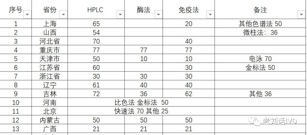 从全球范围看,糖化血红蛋白分析仪,共有64个生产厂家。来自10个国家:中国、美国、日本、韩国、德国、英国、挪威、瑞士、意大利、印度。其中,厂家所属国数量前三的有:中国46家、美国4家、日本3家、韩国3家。在国内,主要分布省份:广东11家、江苏10家、山东5家、浙江4家,超过65%。具体厂家及型号详见下表。下表主要统计专用糖化血红蛋白分析仪,对于其他生化分析仪、免疫分析仪,虽然也能测,但暂时先不统计。因此,下表厂家中,未列生化、免疫厂家,特此说明一下。从全球范围看,糖化血红蛋白检测试剂,主要有318个生产厂家。因为统计的NMPA的缘故,所以国内厂家要多一些。另外,能测糖化血红蛋白这个标志物,不一定代表该企业的主要精力,在糖化赛道上。国内糖化检测试剂厂家,主要来自广东47家、湖南42家、江苏39家、北京30家、浙江25家、山东19家、上海17家,其余省份试剂厂家数量,均在10家以内。1、《全球糖化血红蛋白分析仪研究报告》,总共106页PPT。汇总了全球64个厂家165个型号的仪器图片、参数分析。