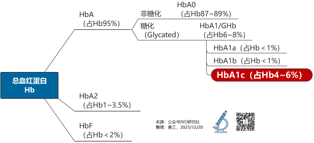 最新的《IDF全球糖尿病地图(第10版)》显示,截至2021年全球约5.37亿成年人(20-79岁)患有糖尿病,预计2045年全球患者人数将激增至7.84亿人。中国糖尿病患者人数达1.41亿人,占比超过26%,发病率高达12.8%,患病率和患病数量均高居全球第一。如此多的患者,该如何确诊呢?糖化血红蛋白,是如何形成的,如何被发现的?又是如何成为糖尿病诊断的“金标准”?目前国内糖化检测市场竞争格局怎么样,市场规模有多大?主要采用哪些技术和方法来检测?糖化仪器和试剂系统组分是什么,研发难点在哪里?全球范围内糖化产品主要生产厂家有哪些,它们实力如何?全球糖化技术和市场,未来发展趋势如何?这一系列问题,都亟待解决。黄工花了10天 搜了400M资料,进一步学习研究和整理归纳,写出本文,试着回答这些问题。糖化血红蛋白,英文全称:Glycated Hemoglobin A1c,简称HbA1c,是人体血液中葡萄糖与血红蛋白β链N末端缬氨酸残基以共价键结合的稳定的化合物,全称为:血红蛋白β链(血液)-N-(1-脱氧果糖-1-基)血红蛋白β链。也可以理解糖化血红蛋白,是红细胞中血红蛋白与葡萄糖的结合产物。血红蛋白随着血液流动,将肺里的氧气带到全身各处,为各处细胞供氧。血红蛋白与血液中的葡萄糖结合,自此就变成了“糖化血红蛋白”,这个过程叫糖基化,也叫糖化。因为葡萄糖是人体重要能量来源,在血液中运输。葡萄糖从血液中进入红细胞,就会碰到血红蛋白。一般来说,血液中的葡萄糖浓度,会在一个正常范围波动,空腹静脉血浆葡萄糖浓度在3.9~6.0mmol/L,进食后静脉血浆葡萄糖浓度小于7.8mmol/L。这时候的血红蛋白,碰到葡萄糖的几率就小很多,只有4~6%的血红蛋白被糖基化。但若是患了糖尿病,血液中葡萄糖浓度升高,并且高浓度葡萄糖保持的时间很长,这时候被糖化形成的糖化血红蛋白,含量就会超出正常范围。一般来说,成人的血红蛋白(Hb),由3种成分构成:HbA(占95%)、HbA2(占1~3.5%)、HBF(占<2%)。HbA中一部分,被糖化形成GHb。GHb又称HbA1,通常占总血红蛋白的6~8%。根据成分不同,HbA1又进一步分成3种。经过换算,HbA1c含量最高,占HbA1在60~80%,也是日常最普遍检测的部分,因此临床也用HbA1c代替HbA1(GHb)的含量。