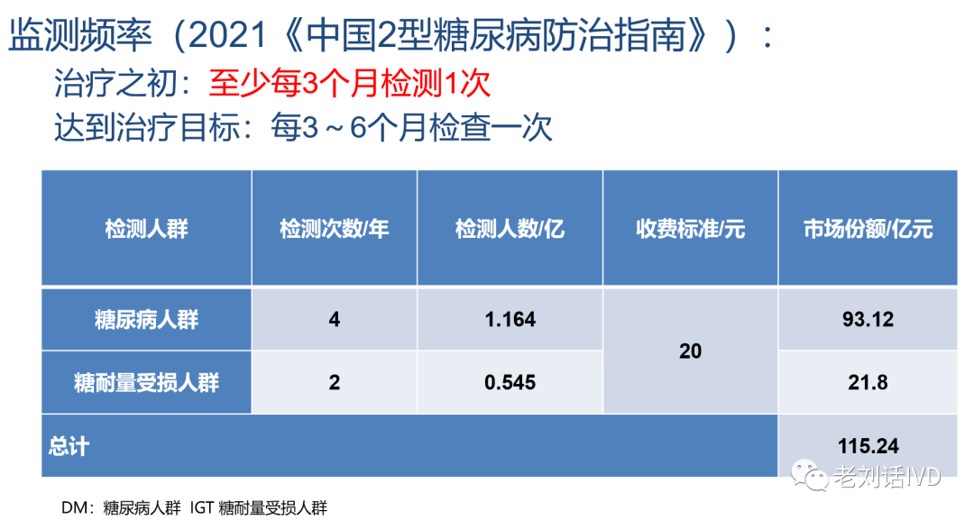 综合多家机构数据,到2023年,国内糖化血红蛋白检测市场,按市场份额排序,进口前三是:①美国伯乐Bio-Rad,约占21%;②日本东曹Tosoh,约占17%;③日本爱科来Arkray,约占13%。国产前三是:①上海惠中,约占10%;②深圳普门,约占4%;③深圳迈瑞,约占3%。综合来看,进口品牌所占市场份额,达到70%,呈现一边倒的格局。那糖化市场,当下及未来,会有多大的市场空间呢?我们引用公众号“老刘话IVD”的推算数据,总体超过100亿的规模。下表是老刘对全国糖化项目收费情况的统计,并基于此,对国内市场做了一个测算模型。除此之外,还未搜索到公开的对国内糖化市场规模预测的数据和信息。