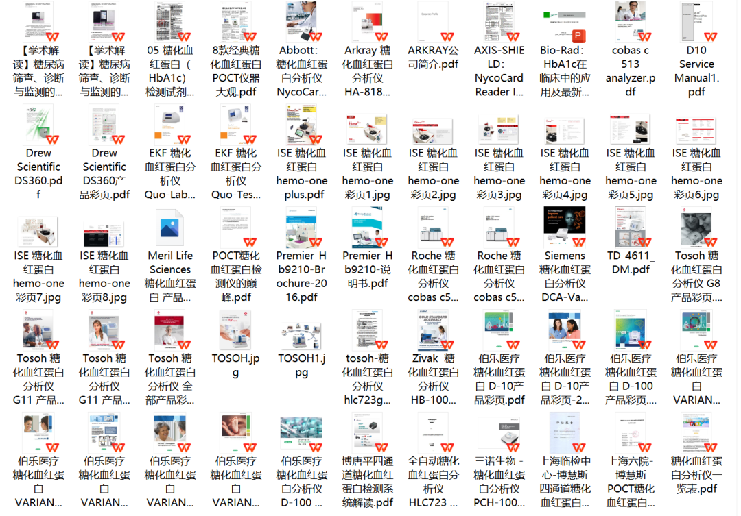 2、5张Excel表:表1:汇总图表;表2:仪器厂家及型号总表;表3:仪器参数分析对比总表;表4:糖化试剂注册证总表;表5:糖化血红蛋白厂家档案表。3、400M研究资料:包括4大类,市场研究资料,产品彩页和手册资料,行业标准资料,指南共识资料等。