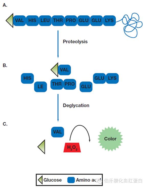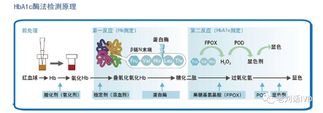- 酶法:基本原理为全血样本用溶血剂处理后,其中的血红蛋白与试剂中的蛋白酶反应,切断血红蛋白的β链N末端的糖化二肽,生成的糖化氨基酸片段在果糖氨基酸氧化酶的催化下生成H₂O₂,通过与色原反应在700nm吸光度变化而得出HbA1浓度。可以从下方两张图,综合了解酶法原理。