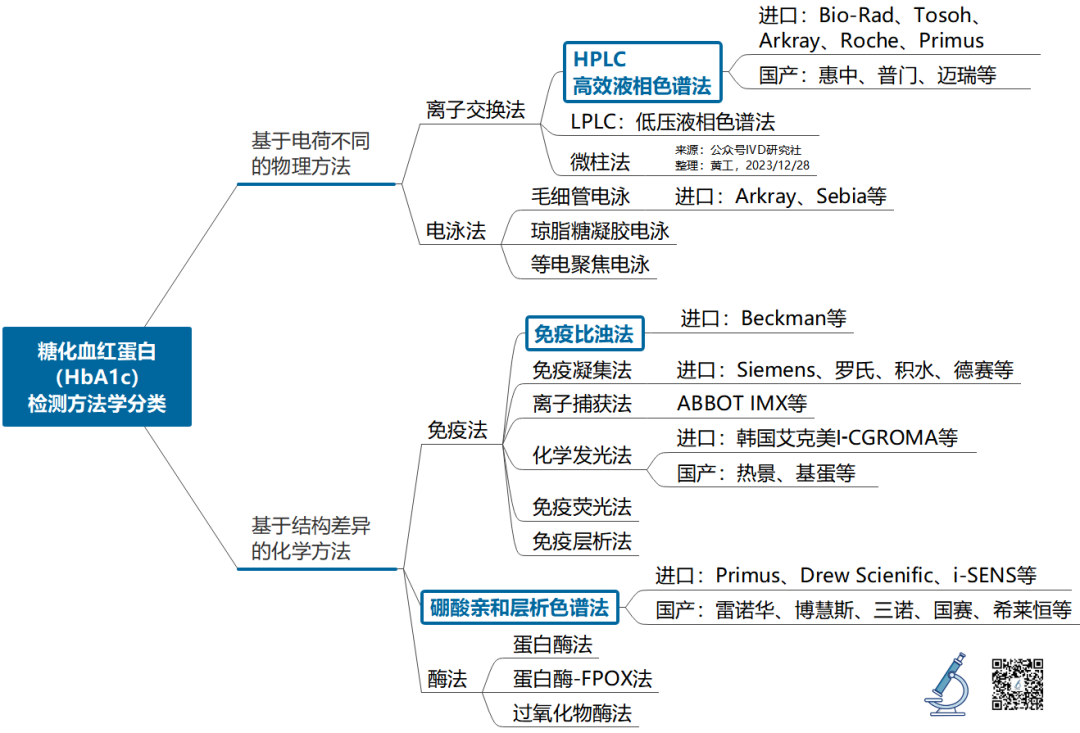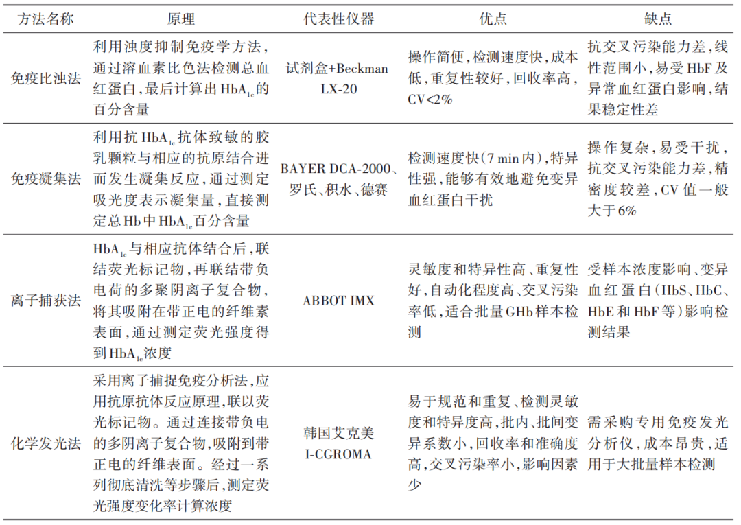 - 免疫法:免疫分析法以 HbA1c 为抗原,基于抗原-抗体识别原理进行测定,通常以糖化血红蛋白β链N末端 4~8个氨基酸残基作为抗体识别位点,检测 IFCC 参考系统定义的“真正的”HbA1c。包括:免疫比浊法、免疫层析法、免疫荧光法、化学发光法、免疫凝集法、免疫抑制比浊法、离子捕获法等。