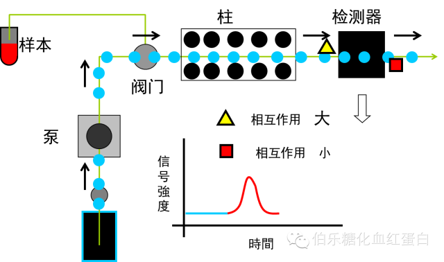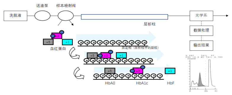 - 高效液相色谱法(HPLC),也是IFCC和NGSP推荐的,测定糖化血红蛋白的金标准。美国、瑞典及日本等国家均将其作为HbA1c标准化参考系统的标准检测方法,同时也是我国糖化血红蛋白检测质量标准化的推荐方法。HPLC可对全血直接测定。其原理为在选定浓度洗脱液的离子强度条件下,由于血红蛋白中各组分所带电荷不同,通过阳离子交换树脂分离。通常基于HbA1c与其它血红蛋白组分(HbA1a、HbA1b、HbF、HbA0)所带电荷不同,在一定的缓冲液离子强度下可与色谱柱(层析柱)树脂表面偶联的离子基团不同程度的结合,从而将HbA1c与其它组分区分开而分离,检测从色谱柱(层析柱)洗脱各成分的吸光度,根据每个峰值下的面积计算HbA1c占总Hb的比例,从而获得峰鉴别和含量。