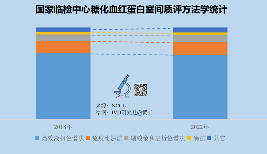 关于不同类别糖化血红蛋白检测方法学的使用频次,可以从3个维度去看:- 维度一:国家卫健委临检中心室间质评(EQA)统计数据