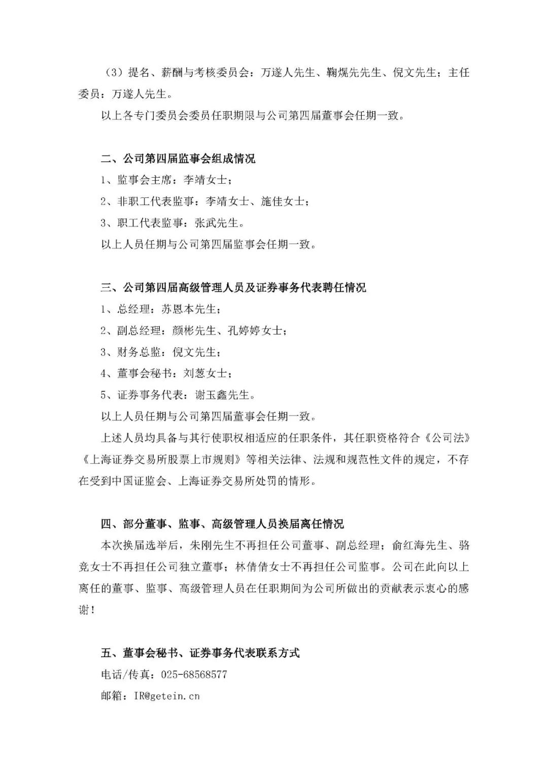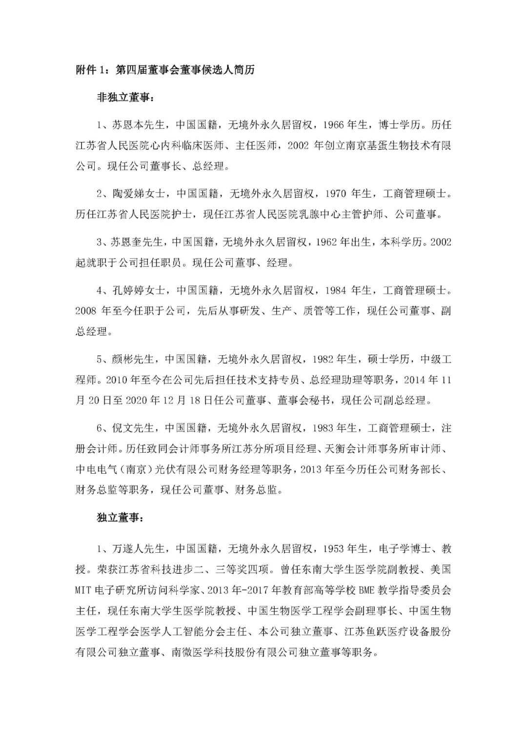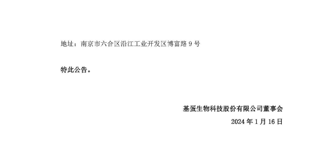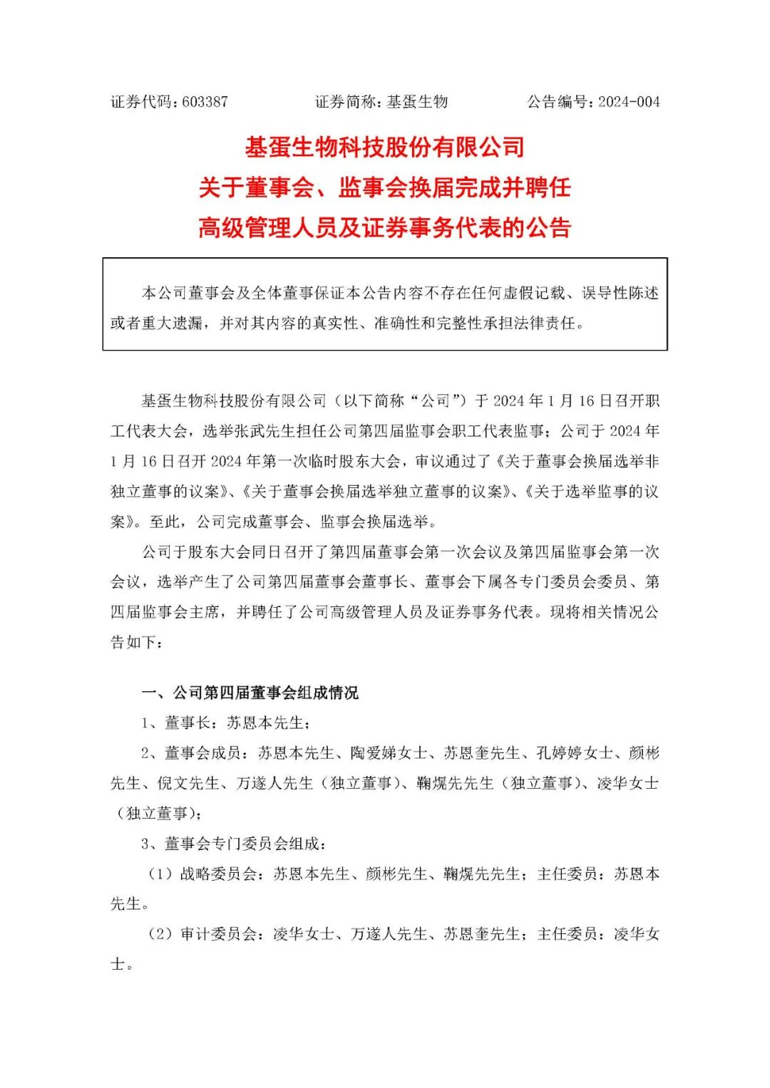 近日,基蛋生物召开了第四届董事会第一次会议及第四届监事会第一次会议,选举产生了公司第四届董事会董事长、董事会下属各专门委员会委员、第四届监事会主席,并聘任了公司高级管理人员及证券事务代表。2、董事会成员:苏恩本先生、陶爱娣女士、苏恩奎先生、孔婷婷女士、颜彬先生、倪文先生、万遂人先生(独立董事)、鞠熀先先生(独立董事)、凌华女士 (独立董事);1、监事会主席:李靖女士;2、非职工代表监事:李靖女士、施佳女士;3、职工代表监事:张武先生。本次换届选举后,朱刚先生不再担任公司董事、副总经理;俞红海先生、骆竞女士不再担任公司独立董事;林倩倩女士不再担任公司监事。