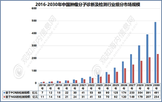 2023年中国肿瘤分子诊断及检测行业市场规模约121亿元,其中,基于PCR的检测规模68亿元;基于NGS的肿瘤分子诊断及检测规模约53亿元。预计2030年,肿瘤分子诊断及检测行业市场规模725亿元,基于PCR的检测规模491亿元;基于NGS的肿瘤分子诊断及检测规模约234亿元。目前来看,PCR的增长速度要高于NGS,但长远来看,NGS有更大的增长潜力。