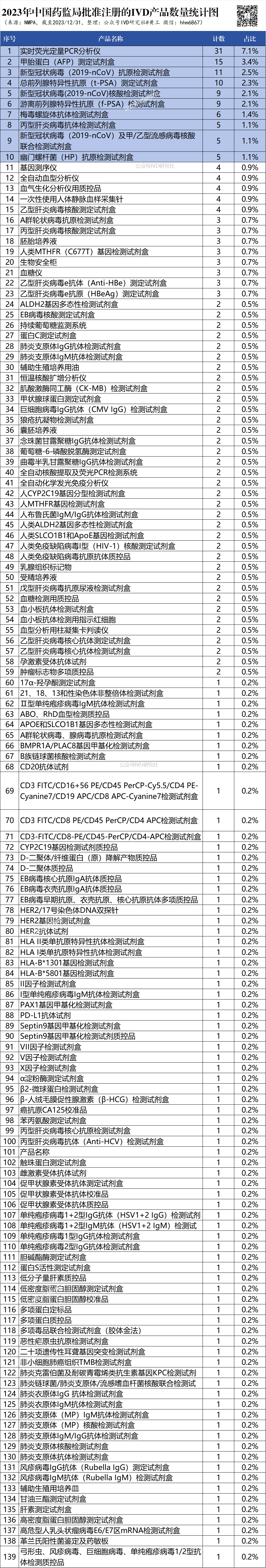 | · 这是第 101 篇原创首发文章 字数 1.5k ·· 黄工 | 文 关注IVD研究社 ID:IVDYJS · 本文为“黄工2023年终盘点”第二篇:产品篇。 “黄工2023年终盘点”第一篇:投融资篇(可点击链接查阅) 2023年中国药监局(NMPA),批准注册医疗器械产品2728个。(1)按地区分,境内三类2079个,占76.2%;进口(三类325个、二类282个)607个,占22.2%;港澳台22个,占0.8%。(2)按产品分,其中IVD产品434个,占15.9%。这434个IVD产品中,境内327个,占75.3%;进口106个,占24.7%。基本国产:进口,呈七三开。黄工从以下4个维度,为大家拆解数据。* 前述数据(2728个)不包括:境内省级药监局批准注册、备案的医疗器械产品,国家药监局批准备案的进口医疗器械产品。境内一、二类,进口备案3项数据统计量太大,暂以点带面,从国家药监局层面了解2023中国IVD产品注册风向。