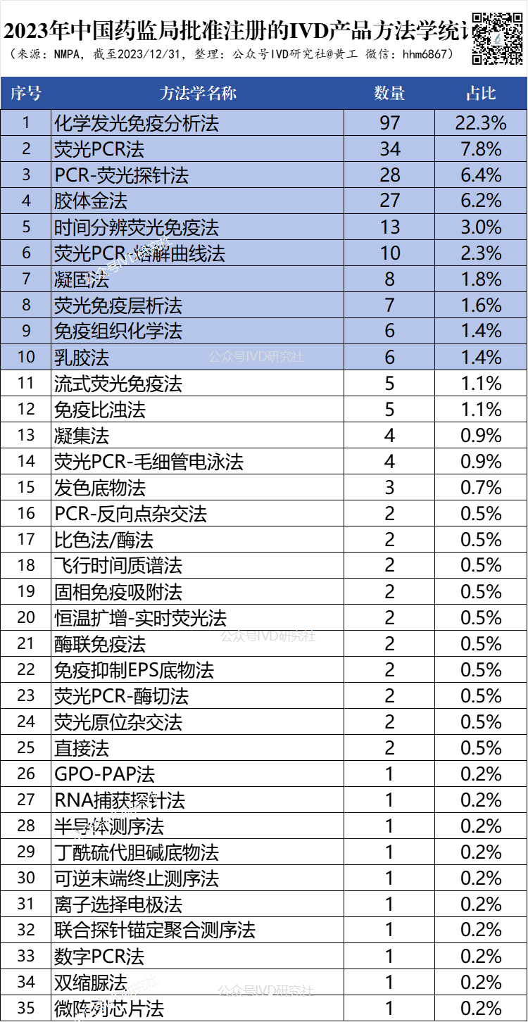哪些公司获批数量最多?2023年,国家药监局批准了208家IVD企业产品注册。从注册数量前10来看,有几个信号:(1)进口罗雅西,新品注册数量仍仍占据前三;(2)全球IVD四大家中的“丹”,2023获批新品没有进前四,前20都没有,贝克曼只以国产的苏州子公司,注册了一个生化分析仪(二类),因此没做统计,其余丹纳赫子公司,以自有品牌注册,比如赛沛等;(3)前10中,没有上市(IPO)的,广州丰华注册产品以乙肝、丙肝、梅毒等传染病检测为主,天津丹娜注册产品以真菌检测为主,康华以丙肝、梅毒等传染病检测为主;(4)前10-20中,深圳韦拓是唯一没有IPO的企业,产品以辅助生殖为主。其余厂家注册数据和信息,参考文首的总表,可以扫码加入下载。2023年国家药监局,批准434个IVD产品。从方法学来看,以免疫学、分子生物学为主。这也体现了这两大IVD市场的规模。化学发光注册证,数量最多,近100个,占据获批产品五分之一的比例。其次是PCR,也占有将近15%的比例。荧光免疫层析(包括胶体金、时间分辨、免疫层析等),也占据了11%的比例。这三大方法学,占据2023年国家药监局批准的IVD产品,将近一半的数量,依然是主流方法学。其余详见下表。