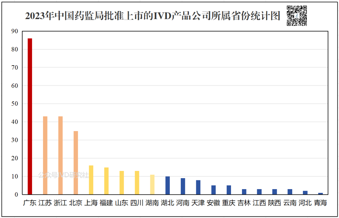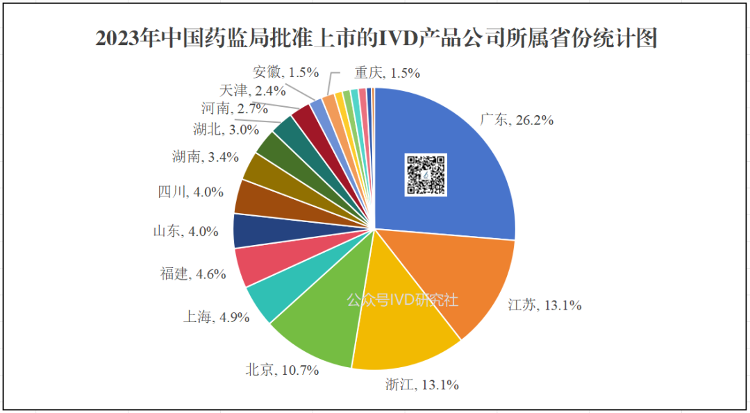 从省份看,2023年国家药监局批准的434个IVD产品,注册人来源于境内20个省份。根据数量大体可分成几类:第一梯队是广东,获批注册证数达86个,占26.2%,一骑绝尘,相当于江苏、浙江、北京任意两省获批产品总和。第二梯队是江苏、浙江和北京,获批注册证数在30-50个之间。第三梯队,是上海、福建、山东、四川、湖南五省,获批数量在10-20个之间。其余省份都在10个以下,说明IVD产业集群非常分散,企业数量不足以支撑产业的高质量发展。其余省份统计图和饼图,见下表。更详细的统计数据,文章开头的汇总Excel表中,可仔细查看。也可以自行选择指标进行统计。声明:本文所引用的图片、文字,版权归原作者所有。本文内容来源于公开资料,IVD研究社不保证其准确性与完整性。IVD研究社对使用本文内容造成的任何损失不负任何责任,请仔细辨析。本文涉及一些医疗相关内容,阅读者如有相关问题请到专业医疗机构诊治,文中内容不作为医疗建议。