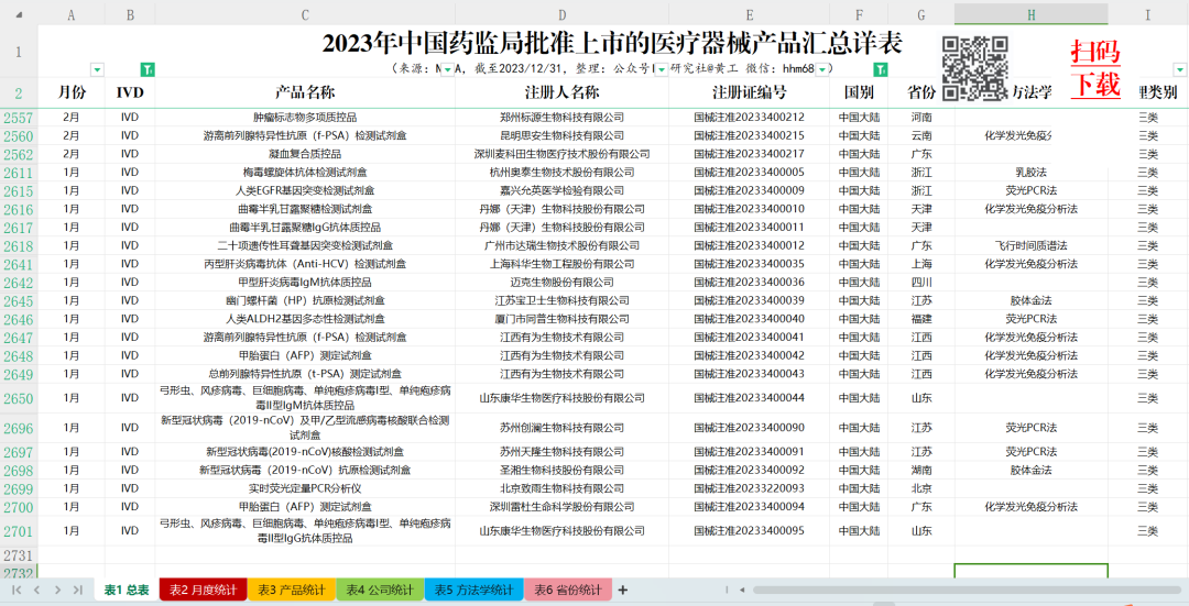 2023年,国家药监局批准注册的IVD产品,共计272种。其中,获批数量排前10 的,包括仪器和试剂。PCR仪和病毒类试剂盒,数量最多。详细获批产品情况,见下表。从中可以看出注册产品方向。当然从注册到获批,有一个时间滞后期,可能产品立项的时间,在两三年前了。要想了解2023年行业整体产品研发方向,还得关注《中国IVD研发蓝皮书》。黄工近期花时间整理,力争在6月份推出。