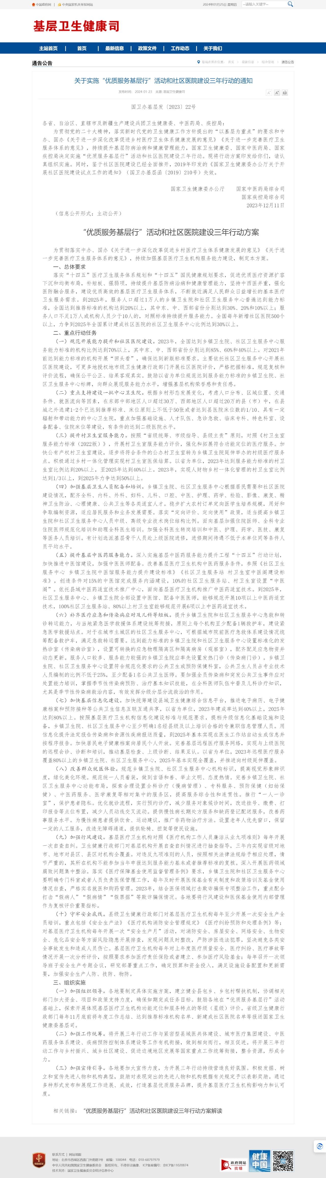 01 三年行动方案公布1月23日,国家卫健委发布《关于实施“优质服务基层行”活动和社区医院建设三年行动的通知》(完整附文末),基层医疗器械市场再迎新风口。通知指出,到2025年,服务人口超过1万人的乡镇卫生院和社区卫生服务中心普遍达到能力标准,全国达到推荐标准的机构达到20%以上,其中东、中、西部省份分别达到30%、20%和10%以上;服务人口不足1万人或机构人员少于10人的,对照标准持续提升服务能力。全国每年新增社区医院500个以上,力争到2025年全国累计建成社区医院的社区卫生服务中心比例达到30%以上。近年来,“推动优质医疗资源下沉”在国家文件中被反复提到。基于广阔的覆盖人群,当基层的医疗能力建设逐步升级,其背后的庞大市场潜力也将得到释放。本次通知公布了基层未来三年的重点发展任务,其中多条与医疗器械配置直接挂钩。通知明确指出,规范开展能力提升和社区医院建设。2023年,全国达到乡镇卫生院、社区卫生服务中心服务能力标准的机构比例达到70%以上,其中东、中、西部省份分别达到85%、60%和40%以上。重点支持建设一批中心卫生院。根据乡村形态发展变化,考虑人口分布、区域位置、交通条件、就医流向等因素,在东部中部地区人口超过30万、西部地区人口超过20万的县(市)中,在县城之外选建1-2个已达到推荐标准、床位原则上不低于50张或者达到县医院床位数的1/10、具有一定辐射和带动能力的中心卫生院,重点加强基础设施、人才队伍、急诊急救、临床专科、特色科室、设备配备、住院床位等建设,有条件的达到二级医院水平。 针对社区医院和中心卫生院的设备配置,去年12月国家卫健委发布了《乡镇卫生院服务能力评价指南(2023版)》与《社区卫生服务中心服务能力评价指南(2023版)》,评价采用A、B、C、D四档表达。各档分别设有不同的设备配置要求,涵盖了DR、彩超、全自动生化分析仪、全自动化学发光免疫分析仪、血凝仪、生物安全柜、十二导联心电图机、空气消毒机、麻醉机、呼吸机胃镜或CT等大批设备。详细见《国家卫健委发布,全国基层设备配置要求》。本次通知还提到,要加强基层卫生人员配备和培训。乡镇卫生院、社区卫生服务中心根据居民需要和社区医院建设情况,配齐全科、内科、外科、妇科、儿科、口腔、中医、护理、药学、检验、影像、康复、精神卫生防治、心理健康、公共卫生等各类适宜人才。此外,补齐医疗应急和传染病应对及儿科等短板。提升乡镇卫生院和社区卫生服务中心急救和转诊转运能力,与当地紧急医学救援体系建设统筹衔接,原则上每个机构至少配备1辆救护车,建设紧急医学救援站点。推动基层检查、上级诊断、结果互认2025年远程医疗基本实现全覆盖乡镇、社区