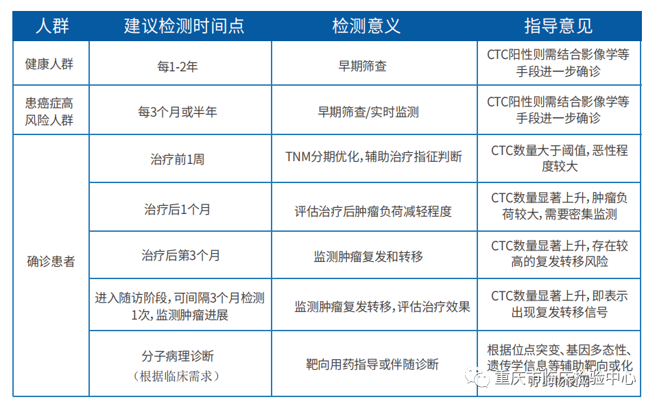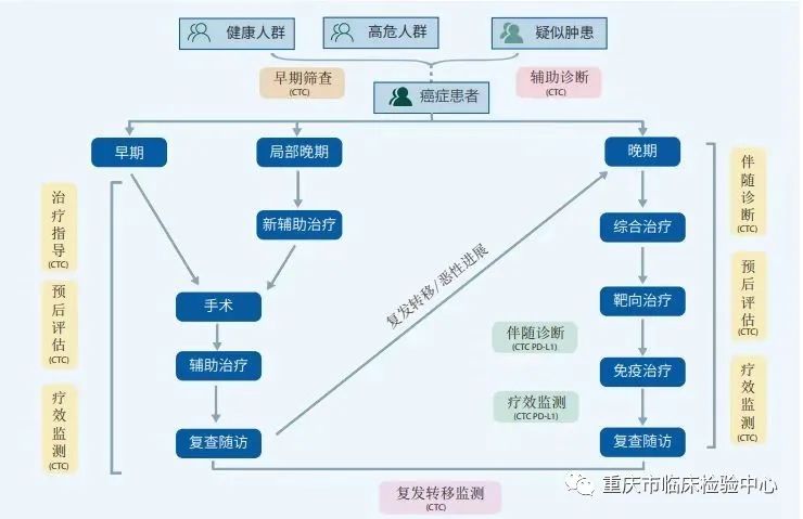- 科 普 天 地 - 肿瘤“吹哨人”-- 循环肿瘤细胞检测 循环肿瘤细胞(CTC,Circulating Tumor Cell)是由实体肿瘤病灶脱落释放进入外周血循环中的肿瘤细胞, 是导至肿瘤转移的关键因素。大部分CTC在进入外周血后发生凋亡或被吞噬,少数能够逃逸并锚着发展成为转移灶,增加恶性肿瘤患者死亡风险。 CTC检测通过捕捉检测外周血中衡量存在的CTC,监测CTC类型和数量变化的趋势,以便实时监测肿瘤动态、评估治疗效果,实现实时个体治疗。 01 CTC的分类 02 CTC的临床应用 早期筛查 相关研究表明,当大多数实体肿瘤1mm时,在影像学手段还未能检测出原发灶之前,就已经有肿瘤细胞进入血液形成CTC。CTC可早于影像学提示肿瘤发生,对肿瘤早期筛查具有重要临床价值。 辅助诊断 对于影像学、病理学和血清肿瘤标志物无法判断的疾病情况,CTC检测能够帮助临床对患者疾病状态做出更准确判断。 预后评估 大量研究表明,CTC是常见高发实体肿瘤预后评估独立预测因子,可对生存期进行预测。 疗效监测 传统疗效评估一般通过影像学检查肿瘤大小实现,而通过比较患者治疗前后血液中CTC数量变化,可以监测肿瘤的细微改变,可比传统影像学检查更早地判断治疗方案的效果。 复发转移监测 传统的监测手段如影像学检查无法及时发现或预测肿瘤的复发转移。CTC实时动态反映肿瘤的发展变化,可早于影像学预警肿瘤的转移和复发风险。且CTC检测可根据需要随时进行,达到实时监测肿瘤动态的目的。 03 不同人群的CTC检测时间表 供稿:刘双,郭元元 |